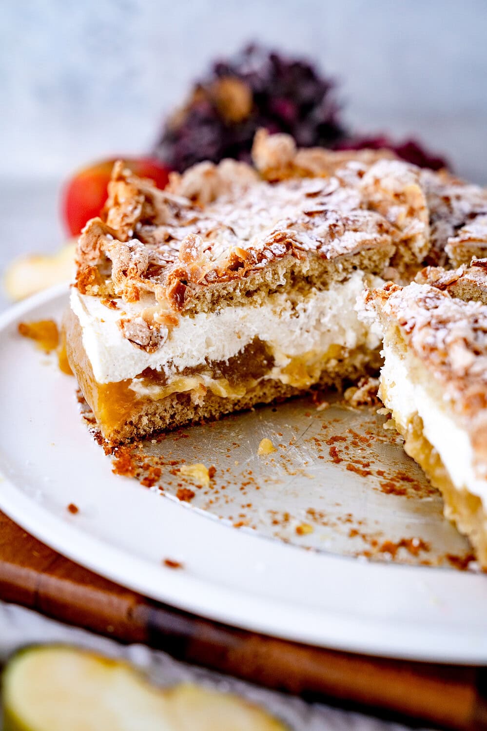 Damit die Apfelschicht beim Anschneiden nicht davonläuft, sondern schön stabil bleibt, kochen wir sie mit etwas Vanillepuddingpulver an. Das bindet den Apfelsaft und die austretende Flüssigkeit der Früchte und sorgt für eine herrlich cremige, aber schnittfeste Konsistenz. So erhältst du perfekte Tortenstücke, die auf dem Teller eine gute Figur machen.