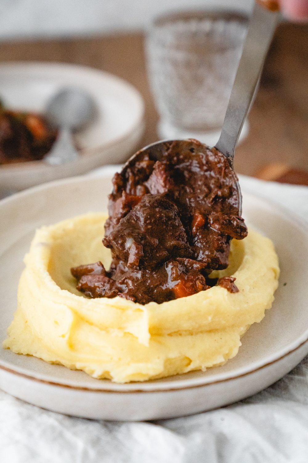 Der Klassiker ist ein cremiges Kartoffelpüree, das die köstliche Soße perfekt aufsaugt. Aber auch Salzkartoffeln, breite Bandnudeln, Vichy-Karotten oder einfach ein frisches Baguette zum Stippen passen wunderbar dazu.