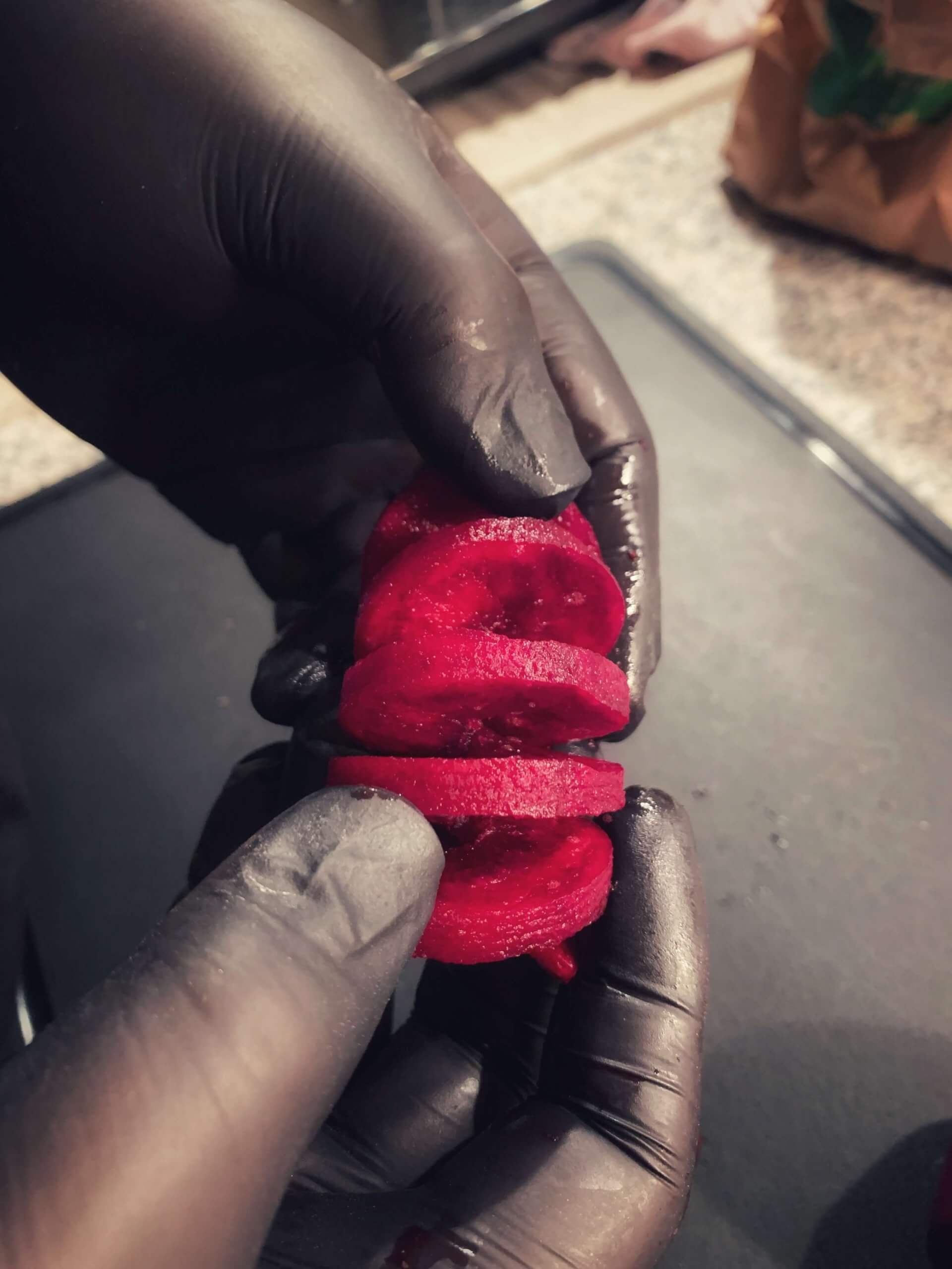 - Bei der roten Bete unten eine dünne Scheibe abschneiden, damit diese später gut steht und dann schälen.