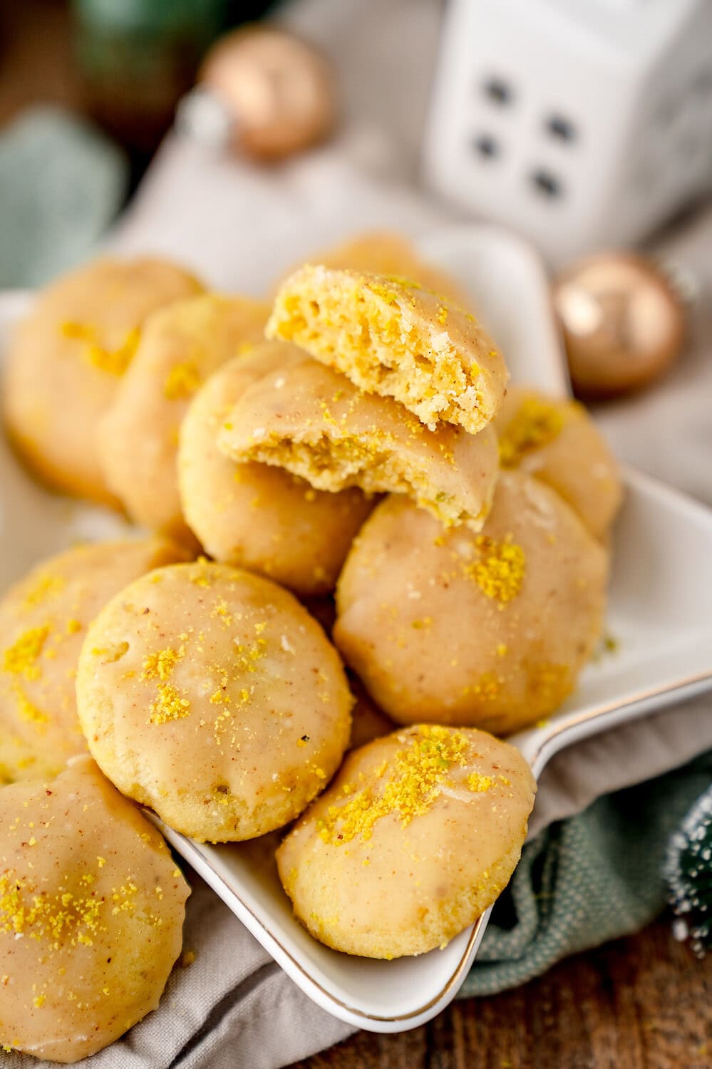 - Variante für den Weihnachtsteller: Dippe die Hälfte des fertigen Kekses nach dem Guss in geschmolzene weiße Schokolade und bestreue ihn dann mit Pistazien. Das ist ein optisches Highlight und gibt einen schönen Crunch! Probiere dazu doch auch mal unsere Pistazien Hefeschnecken: Perfekt für alle Pistazienliebhaber aus.