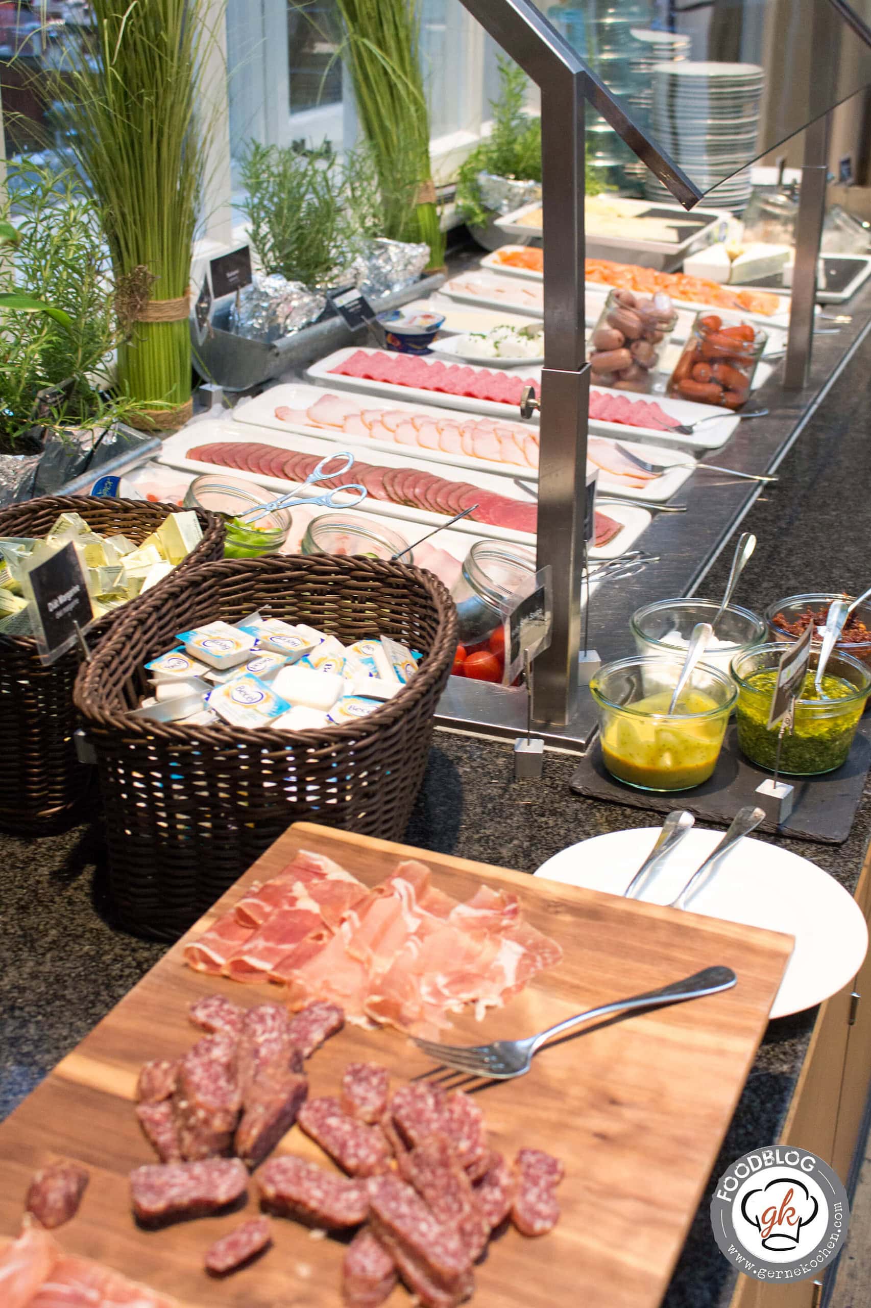 Jeder Morgen begann mit einem tollen Frühstück in dem wunderschönen Innenhof des Mövenpick-Hotel Berlin. Dieser Innenhof war überdacht und die Überdachung wurde bei schönem Wetter aufgefahren, sodass man quasi im Freien frühstückte. Beim Frühstücksbüffet war alles da was das Herz begehrt: Smoothies, frisch gepresste Säfte, Obst und Müsli, Würsten, Rührei und vieles mehr. Mein Herz schlägt natürlich immer höher, wenn ich frischen Lachs bekomme und Bennis Gelüste wurden mit den warmen Speisen befriedigt. Nun kommen wir zu meinem Highlight, trotz Lachs, die Omelette-Station – jeden Morgen ein frisches Omelett, am Liebsten mit Käse und Gemüse, total lecker. Was wir beide ebenfalls noch toll fanden war, dass es auch schweizerische Spezialitäten, wie z.B. das Bündnerfleisch oder den Appenzeller gab. Ach, eine Sache habe ich noch gar nicht erwähnt: Das Vollkornbrot war super lecker, so lecker, dass es sogar Benni geschmeckt hat, der normalerweise nur mein selbst gebackenes Vollkornbrot mag.