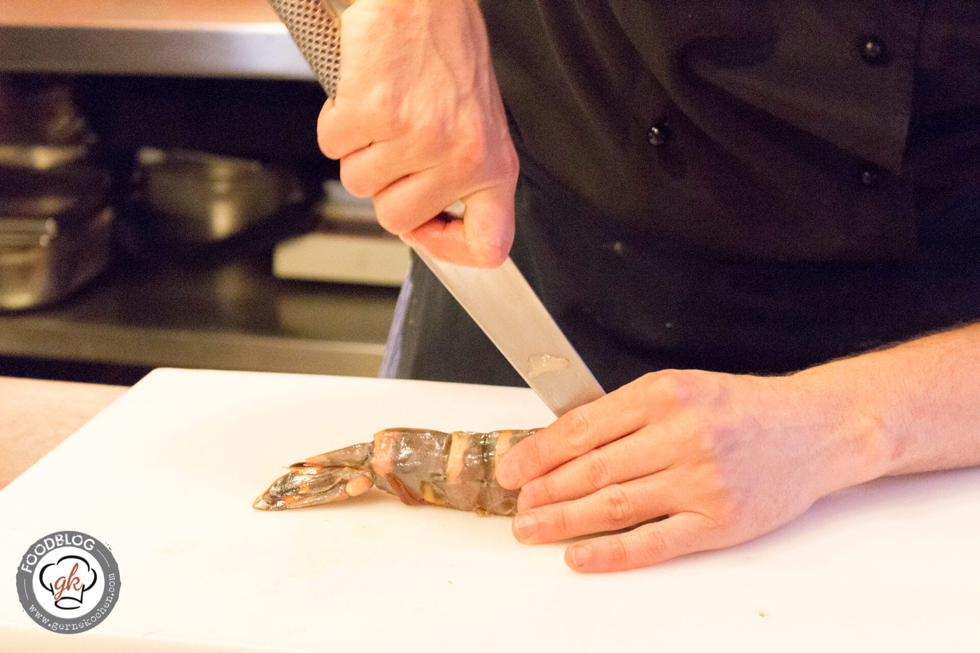 Dann wurden wir in die Küche geführt und das gesamte Team einmal vorgestellt. Daniel hat da echt ein paar tolle Leute um sich, die genauso für ihren Beruf brennen wie er. Mit Steve, Daniels rechte Hand, haben wir uns dann daran gemacht die Speisen vorzubereiten. Benni hat die Crevette, eine davon war auch wirklich sehr monströs, auseinandergenommen und die Seeteufelbäckchen vorbereitet. Ich durfte die Süßkartoffel schälen und zu Pommes schneiden (Jungs, ihr braucht einen neuen Sparschäler, dringend!), den Wildspargel und die Feigen zuschneiden. Anschließend haben wir zugeschaut, wie die Crevettes flambiert wurden und nahmen dann im Restaurant Platz.