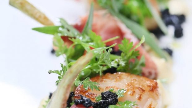 Norwegische Jakobsmuschel, roh mit Limonen Vinaigrette mariniert und gebraten mit Bearnaisemayonaise, Serranoschinken und Artischocken.