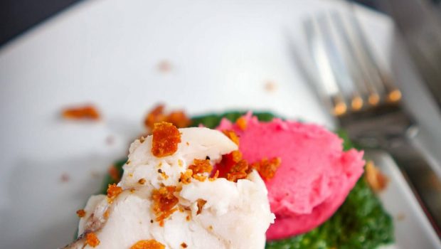 Seeteufel auf Curry-Rahmspinat und pinkem Kartoffelpüree: Gang Nr. 4 beim #10GängefüreinHalleluja