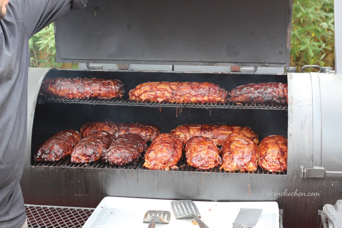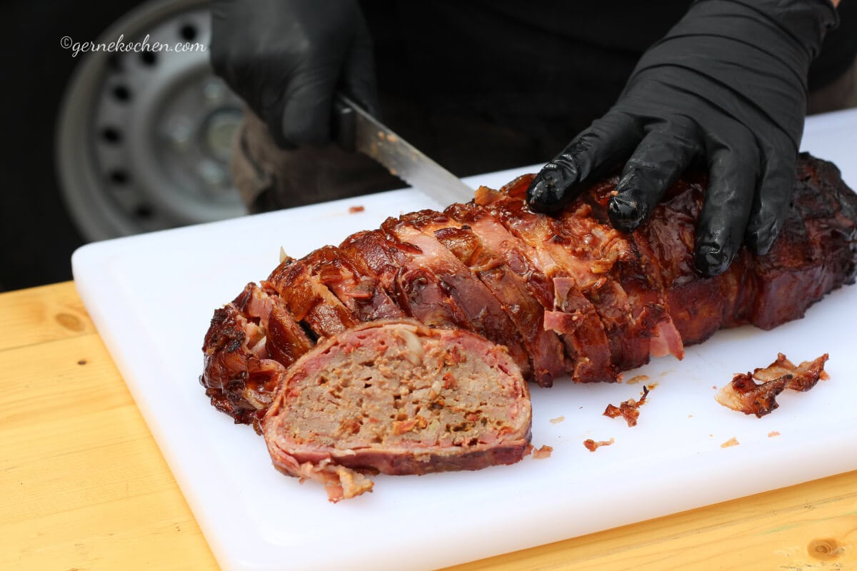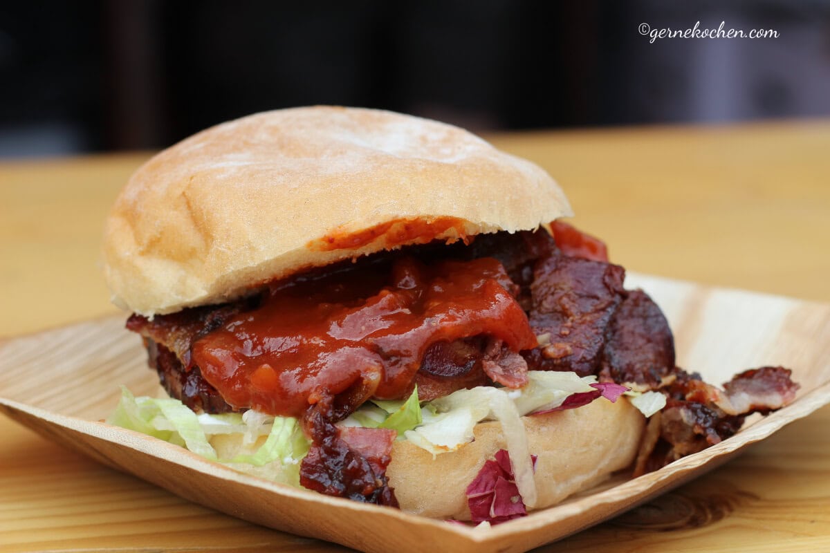 Gestartet sind wir auf dem Street Food Festival am Kaffeestand von Kaffeefahrt. Damit wir frisch und aufnahmefähig das Gelände unsicher machen konnten, gab es erstmal ’ne Kaffeespezialität. Von da aus ging es zum amtierenden Burger Clash Champion, dem Speisewagen. Der hat mit seinem Bacon Bomb Burger den ersten Platz gemacht. Und nach dem wir ihn gekostet hatten, verstanden wir auch wieso. Das Patty wird nicht aus „normalen“, sondern sehr grobem Hackfleisch, fast schon Ragout-ähnlichem gewolften Fleisch gemacht und kommt auch nicht einzeln auf den Grill, tatsächlich wird ein riesiger Smoker befeuert, der dann mit der Bacon Bomb gefüttert wird. Uwe vom Speisewagen nimmt für diese Bombe, eine Mischung aus Rindernacken und Schweinerippe (oder -nacken) mit Cheddar und getrockneten Tomaten. Das Ganze wird mit einem Bacongitter ummantelt und dann für drei Stunden in den Smoker geschoben. Richtig lecker, was da raus kommt! Geschnitten kommt dann eine Bomb – Scheibe in ein wunderbar softes, weiches (man kann es nicht genau beschreiben) Brötchenbun mit einer Soße, Tomatenchutney und Salat!!! Superlecker und absolut verdienter Champion.