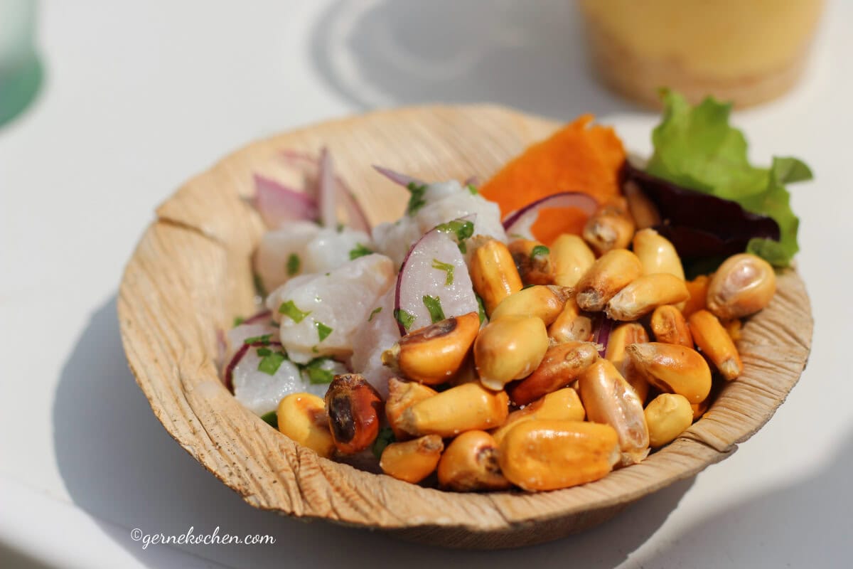 Unsere Reise führte uns ins schöne Peru zu El Huarique, die Ceviche und Causa, Anticuchos sowie Empanadas im Angebot hatten. Die Causa kennt ihr bereits von uns und auch original peruanisch zubereitet, hat es uns total gut geschmeckt. Die drei Damen vom El Huarique waren super sympathisch und machten Lust auf ihre Landesküche. Bei den Anticuchos habe ich mich gegen die klassische Variante entschieden, die aus Rinderherz gemacht wird. So viel Mut konnte ich dann doch nicht aufbringen. Das Ceviche war vom Seebarsch und sehr lecker. Am Besten gefallen hat mir aber der peruanische Mais, der ein wenig an Popcorn erinnert und weniger an Mais. Mal schauen, wo man den hier bekommt, das wäre nämlich meine Alternative zum klassischen Mais, den ich eher meide.
