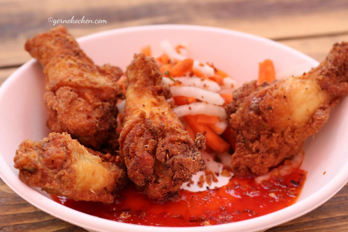 Der nächste Halt war bei den Jungs der Straßenküche, die Chicken Wings im Angebot hatten. Und, soviel sei schon mal vorweggenommen, einen Hammer-Beilagensalat dazu gezaubert haben. Der hat mich am meisten begeistert. Die Chicken Wings waren ganz simpel im Salt&Pepper-Style (mit 4 Pfeffersorten) gewürzt. Durch ihre Einfachheit haben sie aber toll geschmeckt. Im Gespräch mit den beiden, erzählten sie, dass das Hähnchen, welches sie verwenden, aus der Umgebung kommt und es eigentlich sogar Demeter-Qualität besitzt, welches sie aber nicht mit Siegeln bewerben. Wahlweise kann man die Wings mit Sweet-Chili oder Honig Ingwer Sauce bestellen. Beide Varianten sind absolut empfehlenswert.