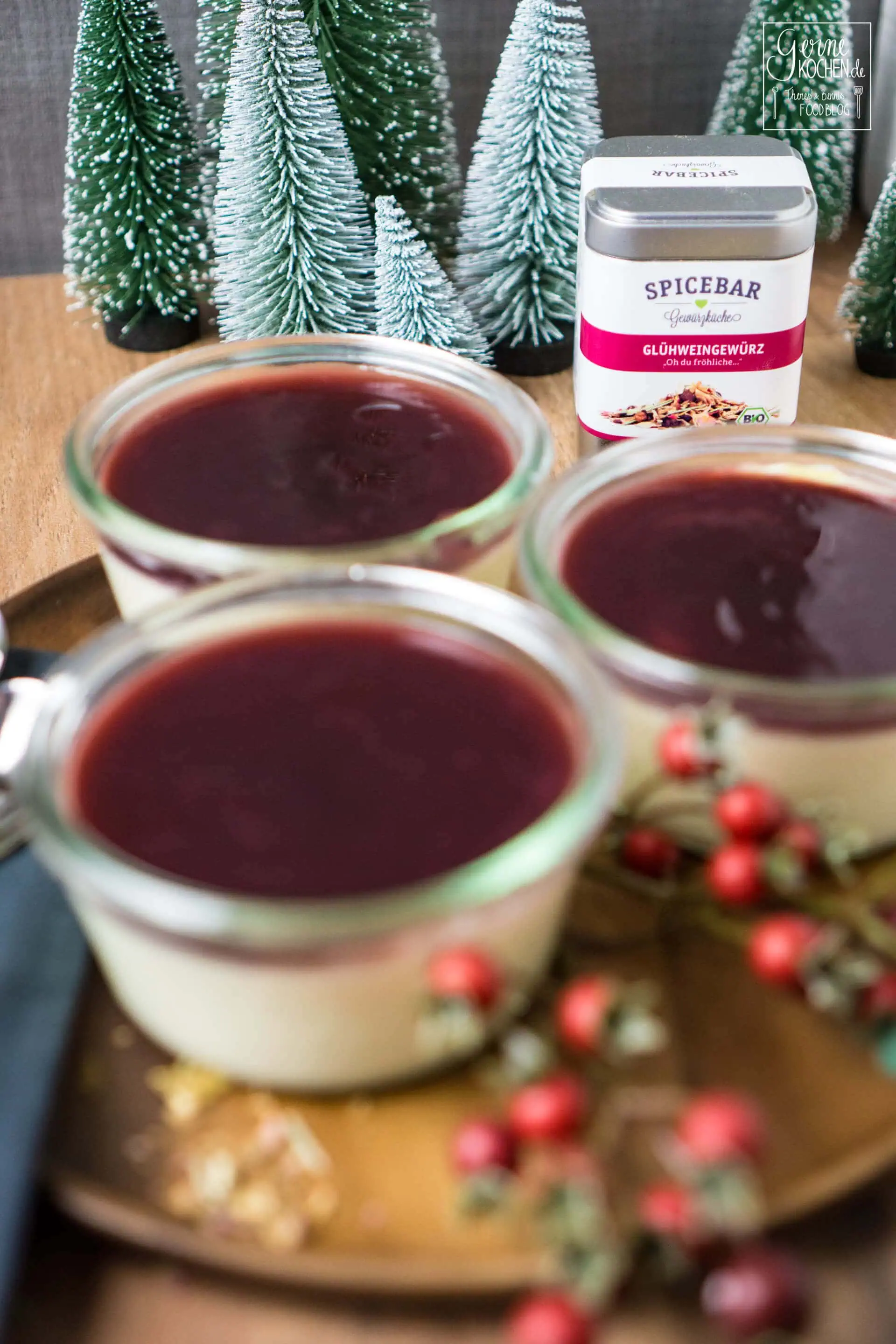Ich war mir nicht sicher, ob Weihnachts Panna Cotta die richtige Bezeichnung ist, denn eigentlich wollte ich sie Glühwein Panna Cotta nennen. Das Problem bei der ganzen Sache ist jedoch… Es ist kein Glühwein drin ;-). Aber eben Glühweingewürz… Zuerst wollte ich oben auch eine Glühwein oder Rotweinsauce als Topping drauf geben, dies war geschmacklich aber einfach zu dominant und ich habe mich für Kirschsaft entschieden und ja, so wurde daraus dann eine Weihnachts Panna Cotta.