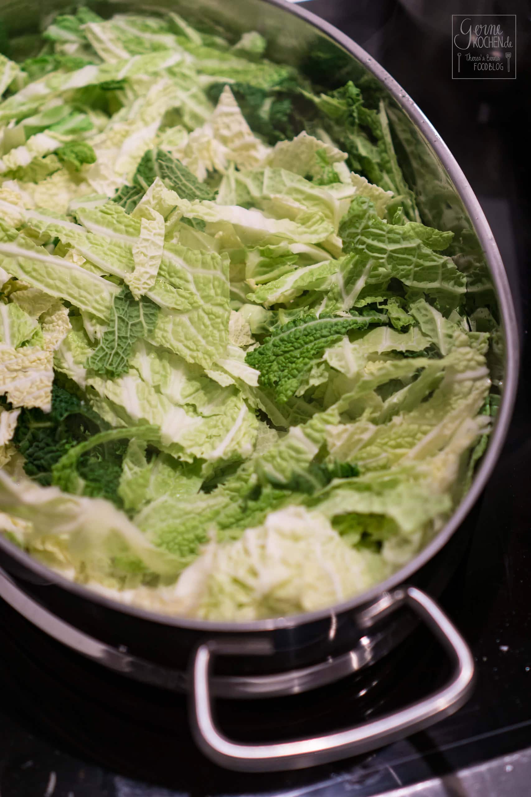 - 1 EL Butterschmalz in der Pfanne heiß werden lassen und den Wirsing darin andünsten.