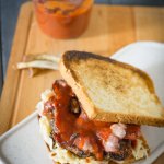 Vor dem servieren die Scheiben vom Sandwichbrot entweder angrillen, braten oder toasten.