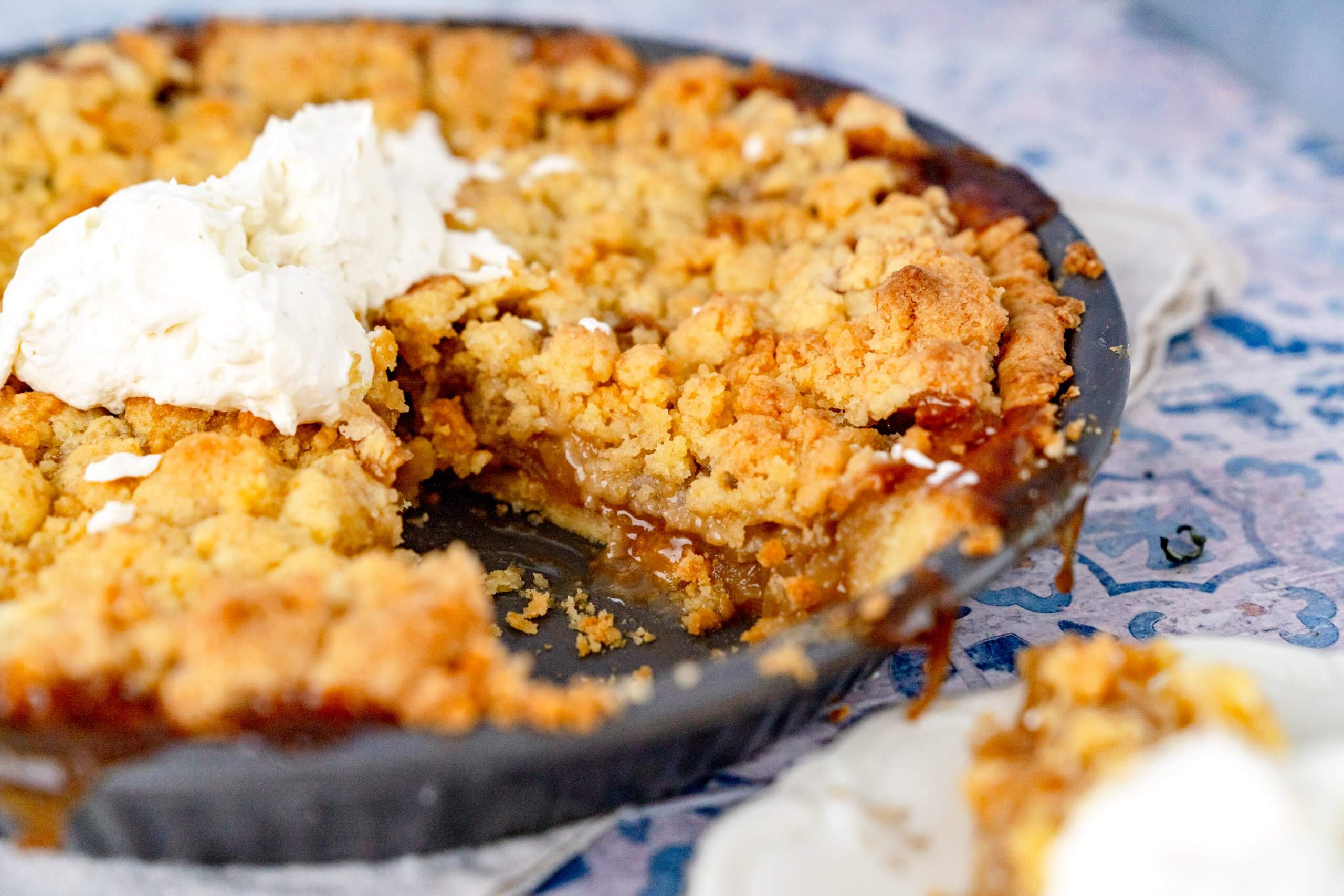 Die Zutaten für die Streusel in eine Schüssel geben und verrühren bis kleine Streusel entstanden sind. Zwei Drittel davon auf den Kuchen verteilen. Den Kuchen für 30 Minuten backen. Die restlichen Streusel dann auf dem Kuchen verteilen und für weitere 15-20 Minuten backen. Der Kuchen sollte schön goldbraun sein.