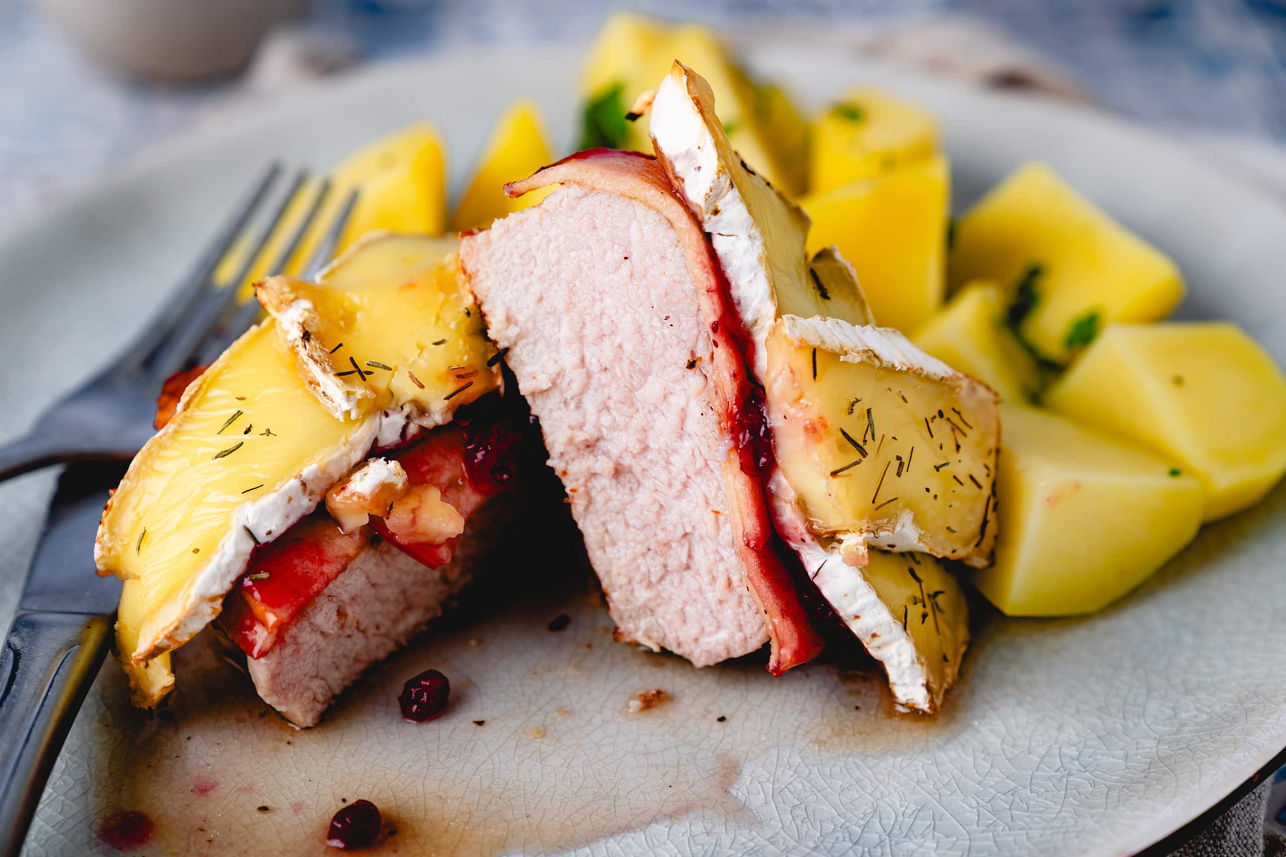 Für ca. 10 Minuten im Ofen die Camembert Schweinerückensteaks überbacken lassen, herausnehmen und servieren.