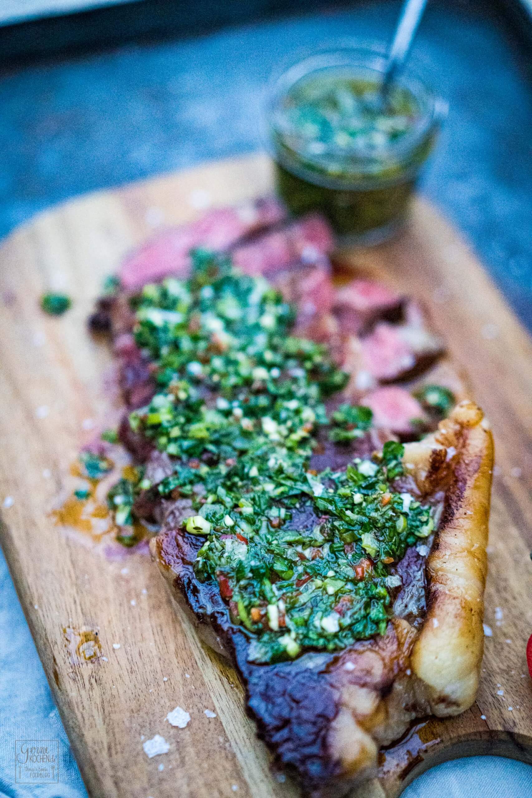 Nehmt ein Schneidebrett und ein scharfes Messer und schneidet alle Kräuter und Knoblauchzehen sehr fein.