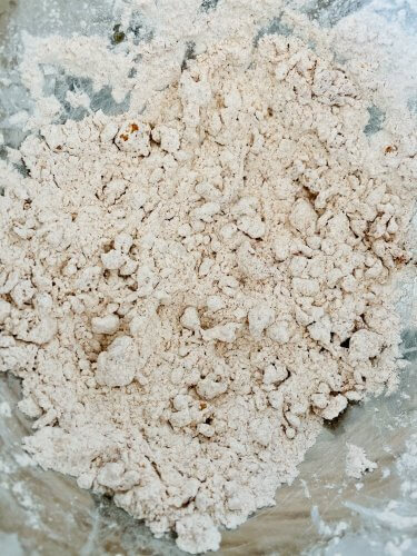 Hähnchen aus dem Kühlschrank holen und dann 6-7 EL von der Marinade in die Panierung geben und mit einer Gabel verrühren, damit leichte Klümpchen entstehen.