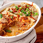 Die perfekte Fusion aus italienischer Lasagne und asiatischen Dumplings! Unsere Dumpling Lasagne spart Dir das mühsame Falten einzelner Teigtaschen. Durch das Schichten von zarten Wantan-Platten und einer würzigen Füllung aus Schweinehack, Chinakohl und asiatischen Aromen entsteht ein saftiger Auflauf, der schonend im Dampf gegart wird. Getoppt mit Chili Crunch und Röstzwiebeln bietet dieses Gericht die ideale Balance aus sanfter Textur und kräftiger Würze. Ein schnelles, authentisches Feierabendgericht für alle Liebhaber der asiatischen Küche, das garantiert gelingt.