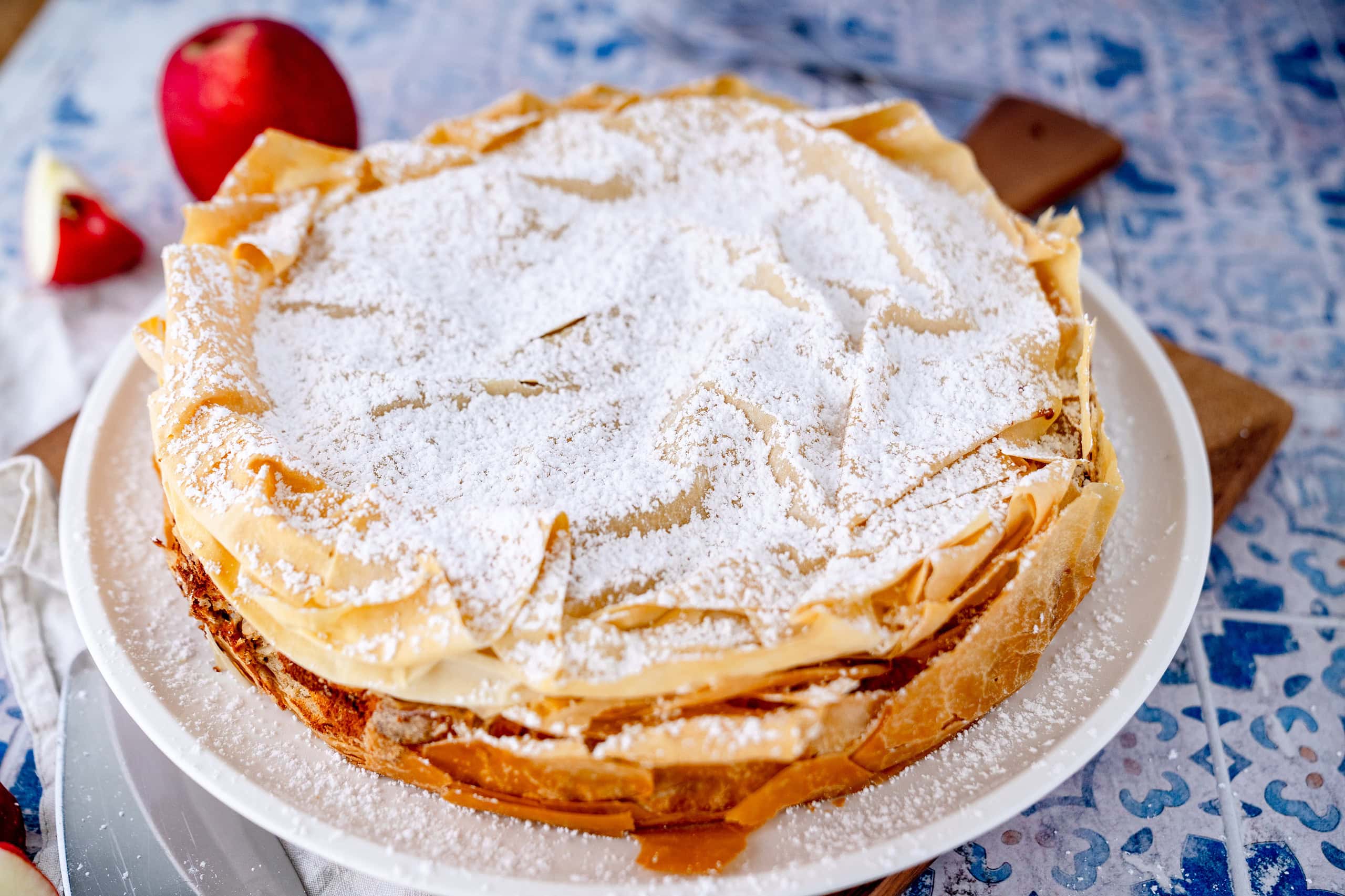 Vor dem Servieren die abgekühlte Strudeltorte mit Puderzucker bestäuben.