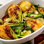 In einer Pfanne den EL Pflanzenöl heiß werden lassen und den Pak Choi mit der Schnittfläche nach unten in die Pfanne legen und für 2 Min. anbraten. Umdrehen und dort auch zwei Minuten anbraten. Rausnehmen und den Kohl beiseite legen.Die Sauce in die Pfanne geben und alles für eine halbe Minute reduzieren lassen. Die Hitze runterdrehen und den Kohl hineingeben. Pak Choi darin wenden und wälzen. Herausnehmen und mit Sesam bestreuen, ggf. noch Chiliflocken.
