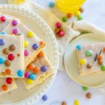 Den Zuckerguss herstellen, in dem ihr Fanta und Puderzucker vermengt. Auf dem kalten Fantakuchen verteilen, für 2 Minuten anziehen lassen, dann die Schokolinsen darauf verteilen.