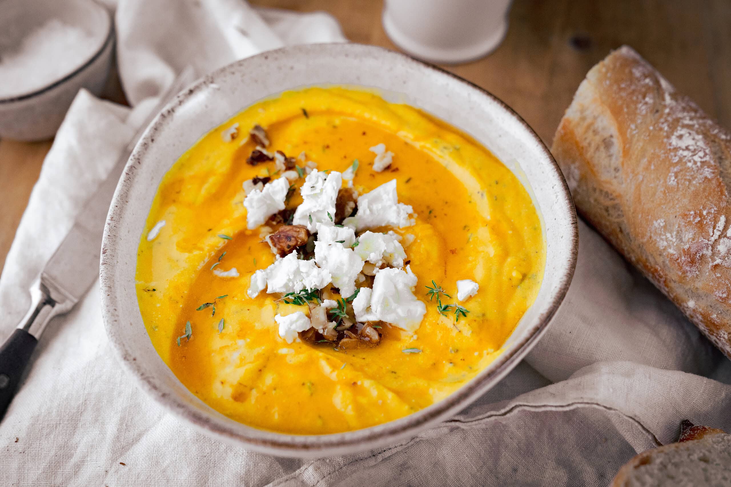 Kürbispüree, Honig, Thymian und Pfeffer hinzugeben und erneut mixen, bis alles verbunden ist. Mit Salz und Pfeffer abschmecken.