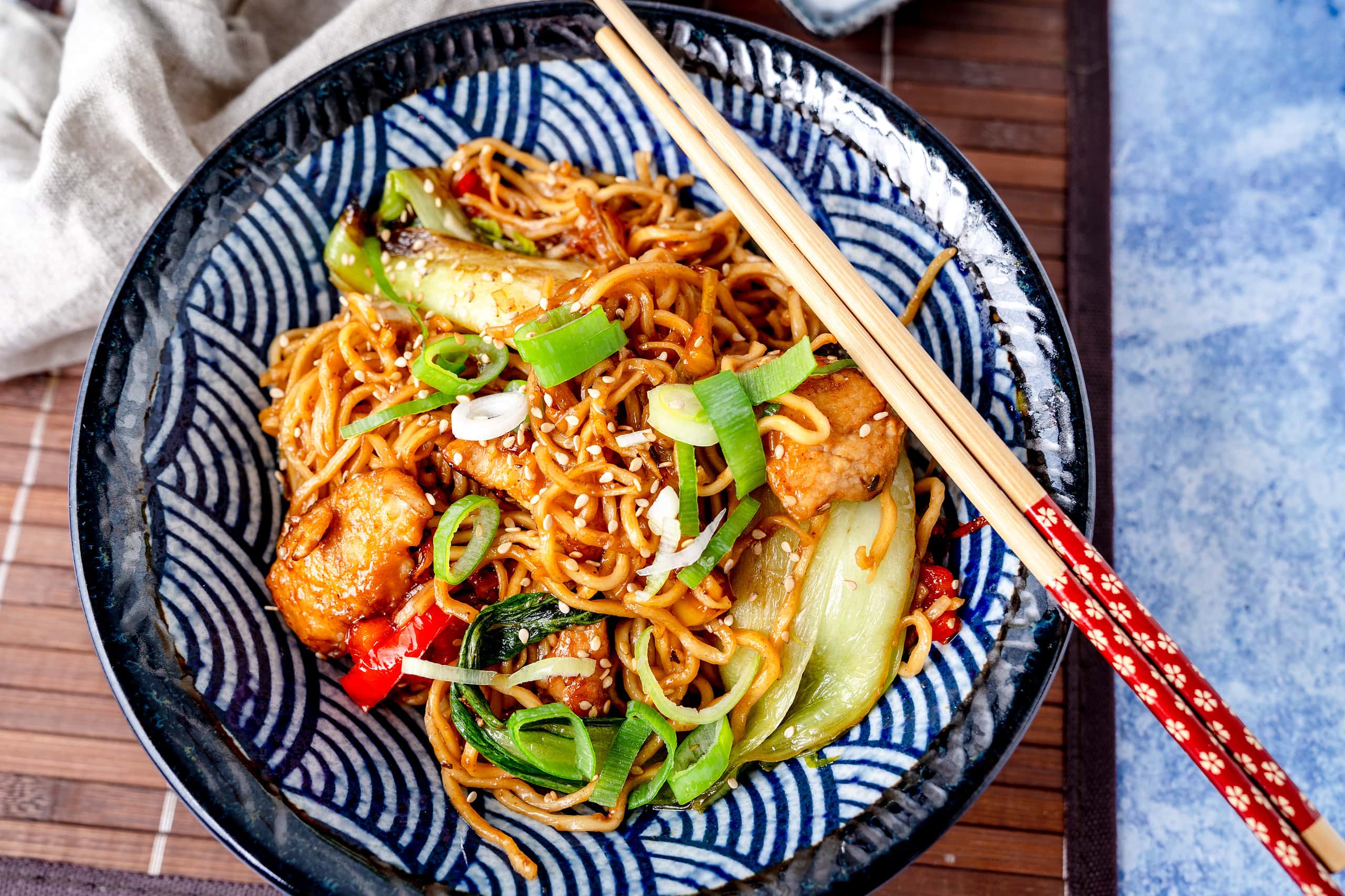 Gebratene Nudeln mit Hähnchen sind der Klassikervom chinesischen Imbiss, der aber auch schnell und einfach zuhause zubereitetwerden kann. Saftige Hähnchenbruststreifen werden zusammen mit leckerem Gemüseund aromatischen Gewürzen in einer Teriyakisoße angebraten. Die Mie-Nudeln verleihen dem Gericht eine angenehme Textur und die gerösteten Sesamsamen sorgen für einen zusätzlichen Geschmackskick. Probiere dieses leckere asiatische Gericht aus und lass dich von den vielfältigen Aromen verzaubern!