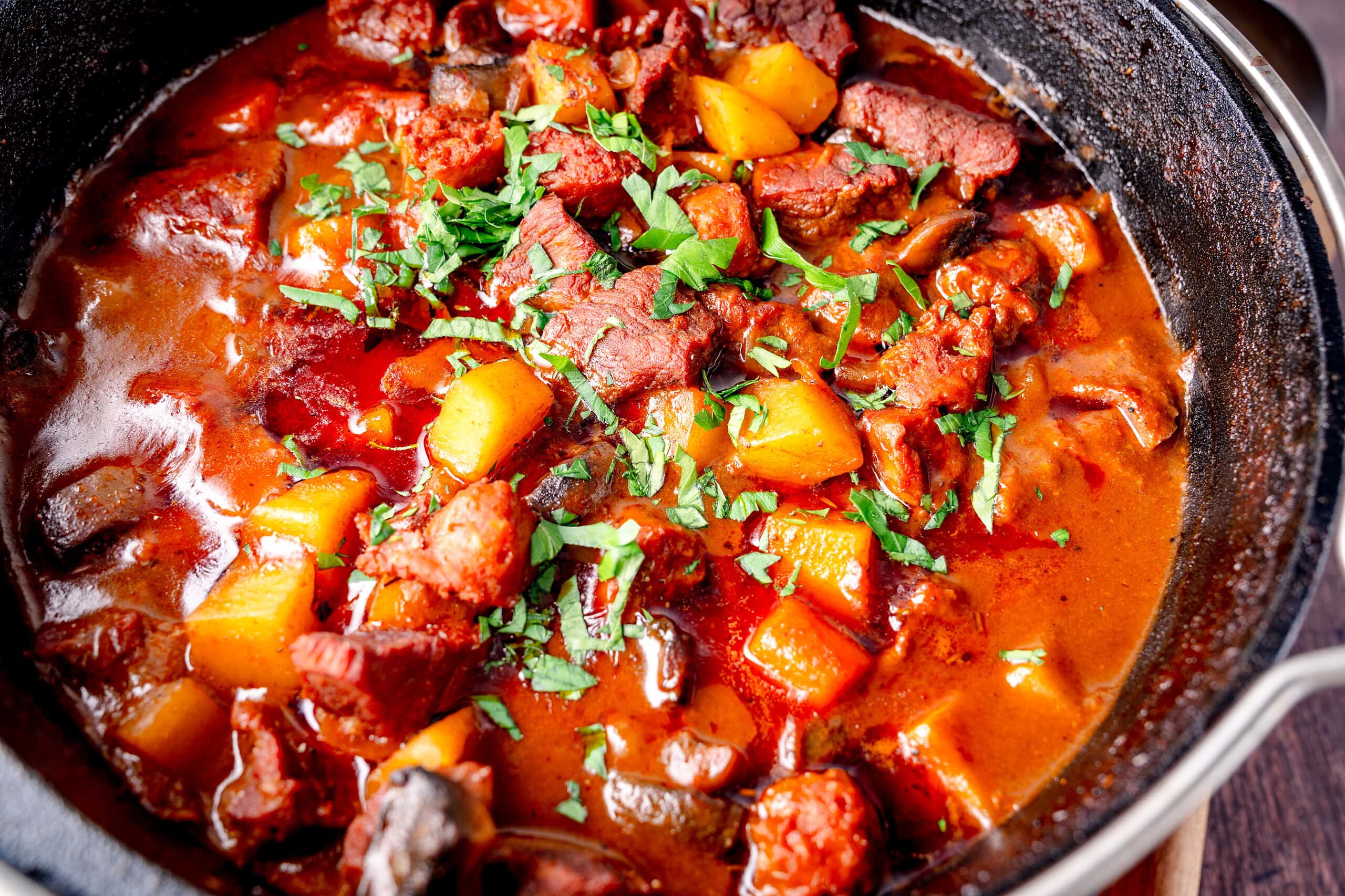 Abschmecken: Den Gulaschtopf nochmal mit Salz und Pfeffer abschmecken. Bei Bedarf mit frisch gehackter Petersilie garnieren.