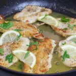 Die Petersilie hacken, die Hähnchen-Piccata wieder in die Pfanne geben und die Petersilie darüber geben und servieren. Nudeln oder Kartoffeln passen perfekt dazu.