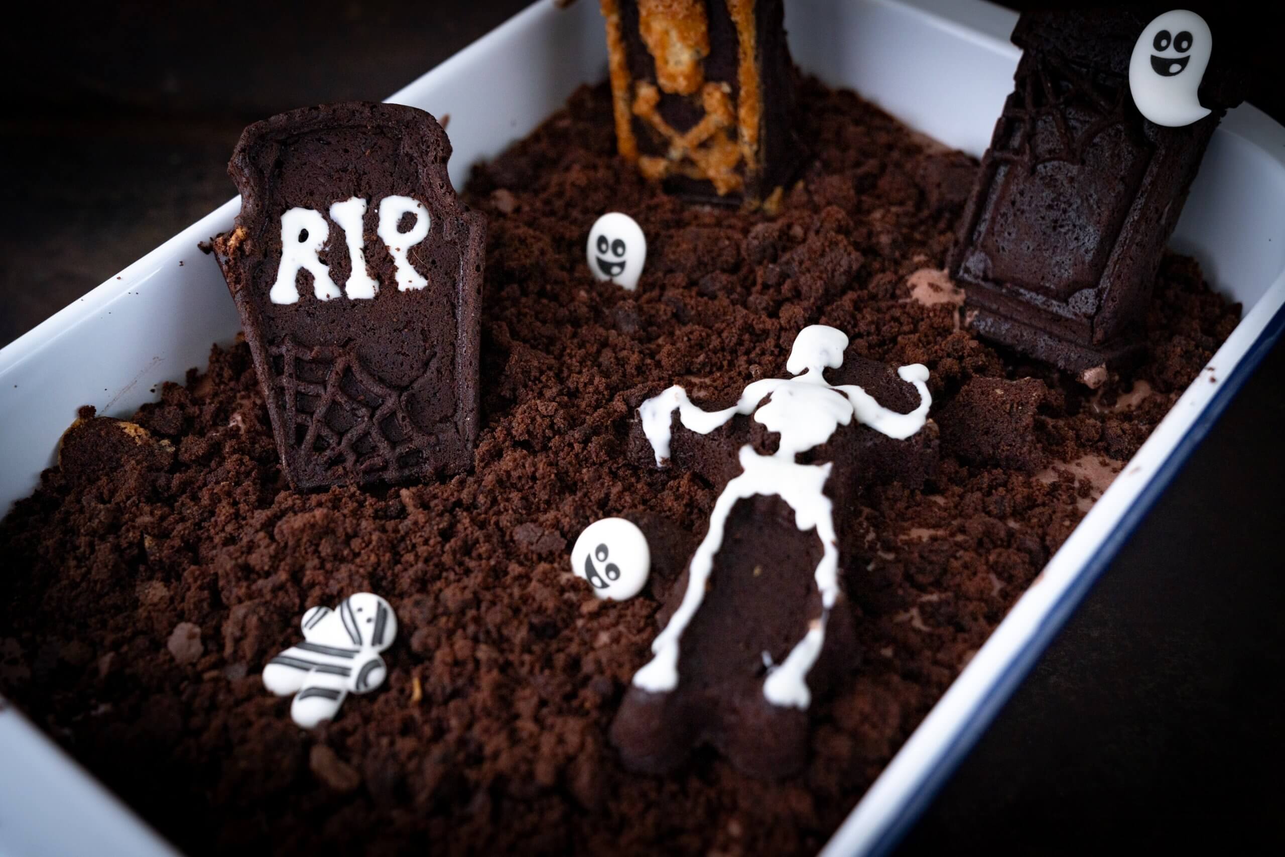 Die Brownie nehmen (nicht die aus der Form) und zerbröseln. Eine Auflaufform nehmen und den Boden mit der Hälfte der Brösel bestreuen. Die Paradiescreme darüberstreichen und die restlichen Brösel darüberstreuen.Mit den gebackenen Formen verzieren und mit der Streudeko bestreuen. Wer mag, kann die Skelette oder die Schriften der Grabsteine mit dem Zuckerstift beschreiben.