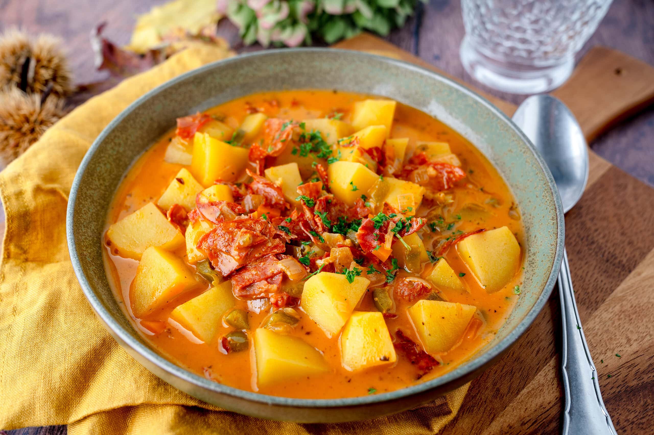 Deftige Kartoffelsuppe trifft auf würzige spanische Chorizo. Das Geheimnis: Kartoffeln und Gewürze werden mitgeröstet, bevor die Brühe dazukommt – das entfaltet die volle Aromenkraft. Mit Paprika, Kreuzkümmel und einer Prise Cayenne wird aus dem deutschen Klassiker ein mediterranes Geschmackserlebnis. Cremig durch Sahne, würzig durch Chorizo und perfekt für gemütliche Herbstabende.