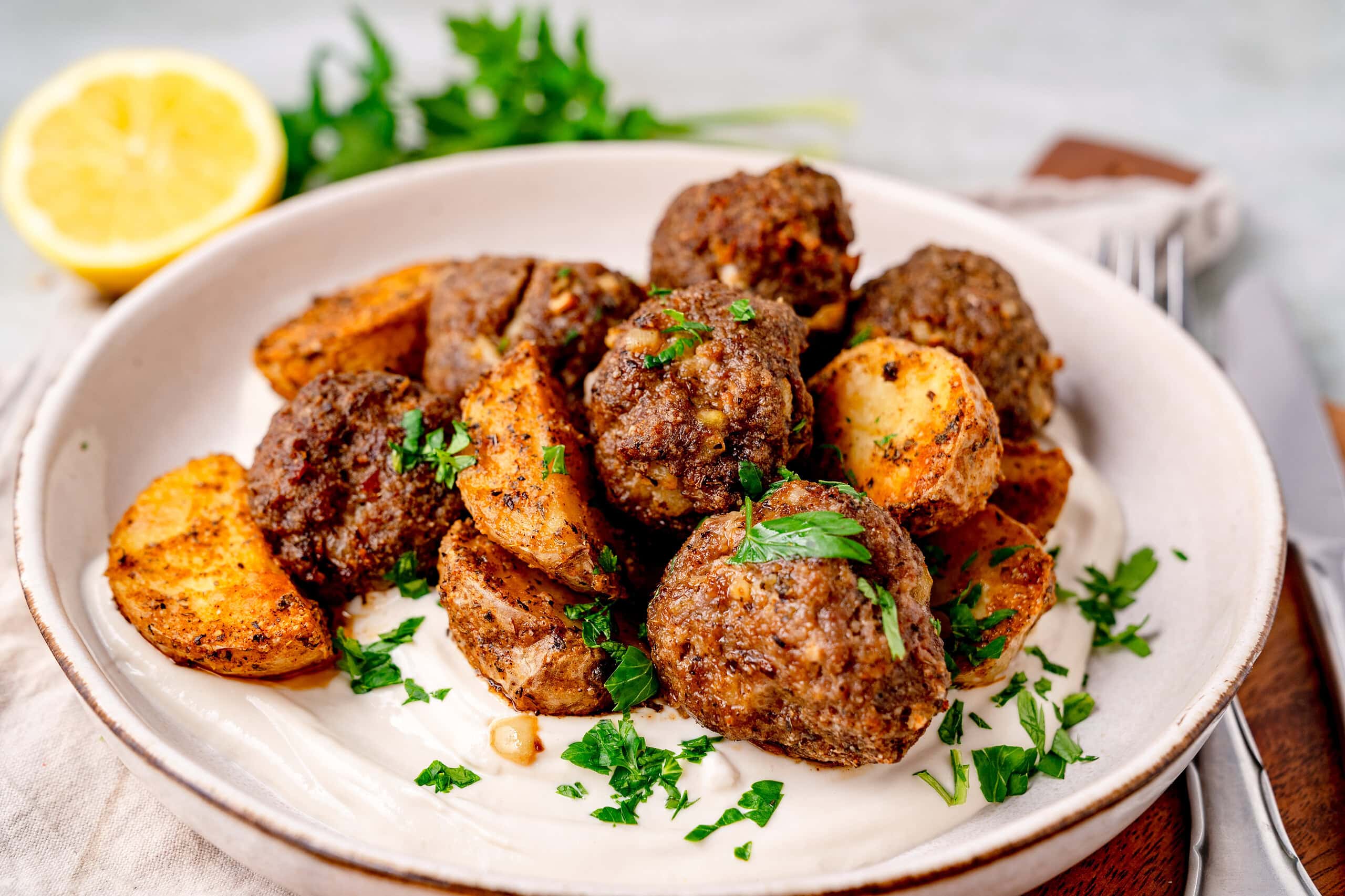 Diese Köftefrikadellen mit Ofenkartoffeln vereinen orientalische Aromen mit dem Komfort eines Ein-Blech-Gerichts. Rinderhack trifft auf Kreuzkümmel, geräucherten Paprika und Minze – gewürzt wie ein Abend in der Levante. Die Kartoffeln werden mit Speisestärke knusprig-kross, die Köfte bleiben saftig und aromatisch. Das Highlight: eine cremige Tahini-Joghurtsauce mit Zitrone und Knoblauch, die so gut ist, dass sie auch zu Wraps oder Gemüse passt. Fertig in unter 45 Minuten – perfekt für ein entspanntes Familienessen.