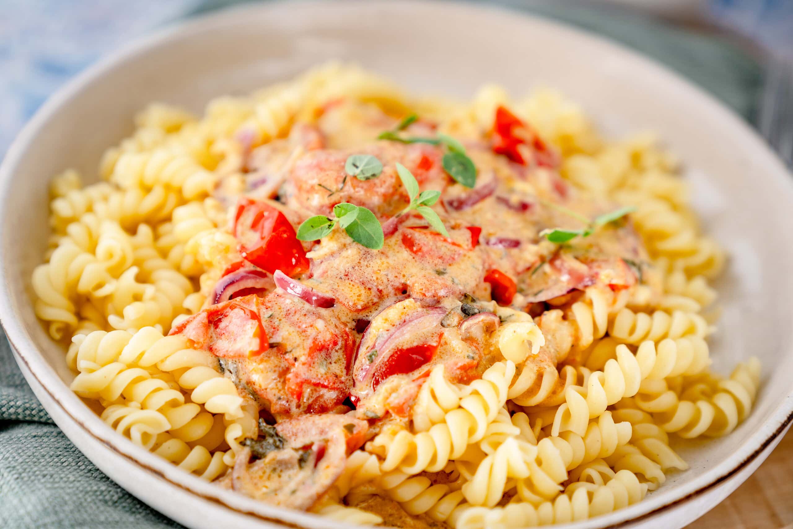 Ein einfaches und leckeres Gericht für die schnelle Küche nach dem Feierabend. Mit französischem Kräuterfrischkäse, Kirschtomaten, Knoblauch, roter Zwiebel, frischen Kräutern (Oregano und Thymian) und Olivenöl wird diese Pasta in einer Auflaufform im Ofen gebacken und dann über die Nudeln gegeben. Das Rezept ist durch seine einfache Zubereitung und den intensiven Geschmack in den sozialen Medien viral gegangen. Ideal für Familien mit Kindern und alle, die nach einem langen Tag schnell etwas Köstliches auf den Tisch bringen möchten.