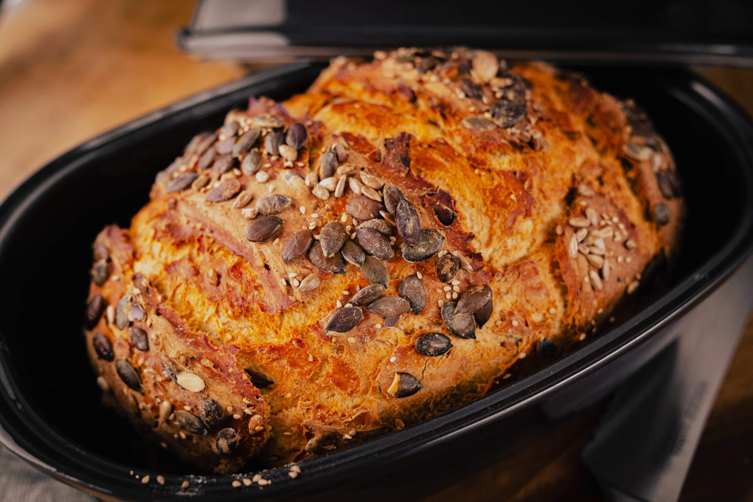 Den Teig aus der Schüssel nehmen und zehnmal falten (Anleitungen sind im Internet zu finden), anschließend einen länglichen Laib daraus formen. Den Laib mit Wasser einsprühen/benetzen und mit ein paar Körnern bedecken. Dann drei Einschnitte auf dem Laib vornehmen und in die Artisan Backform geben, die Backform kann ggf. noch eingemehlt werden).