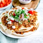 Aus dem Teig 10 gleiche Portionen abtrennen und auf die gewünschte Größe ausrollen. Dann den Fladen mit dem Hackfleischbelag bestreichen und entwedera) im vorgeheiztem Backofen bei 200°C bis zur gewünschten Knusprigkeit backenoder b) eine Pfanne mit etwas Olivenöl auspinseln, den Fladen hineingeben und bei mittlerer Temperatur und geschlossenem Deckel garen, bis das Fleisch durchgegart ist.