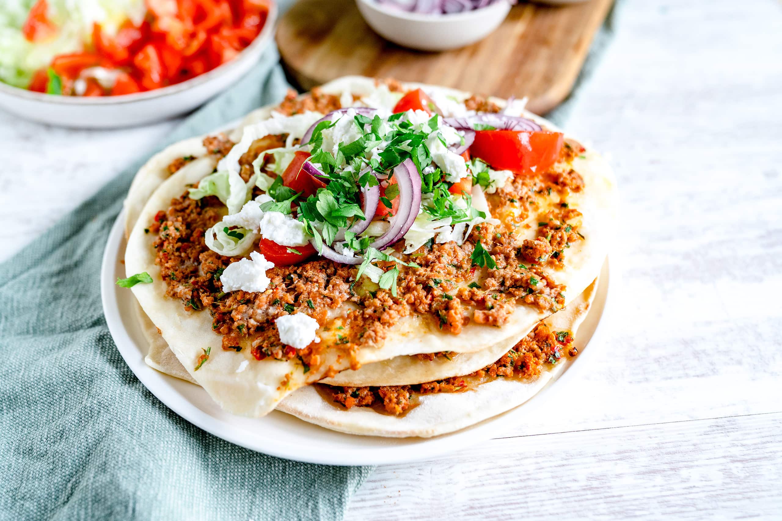 Den Lahmacun nach Wahl mit kleingeschnittenem Salat und Gemüse sowie Tzatziki belegen und genießen.