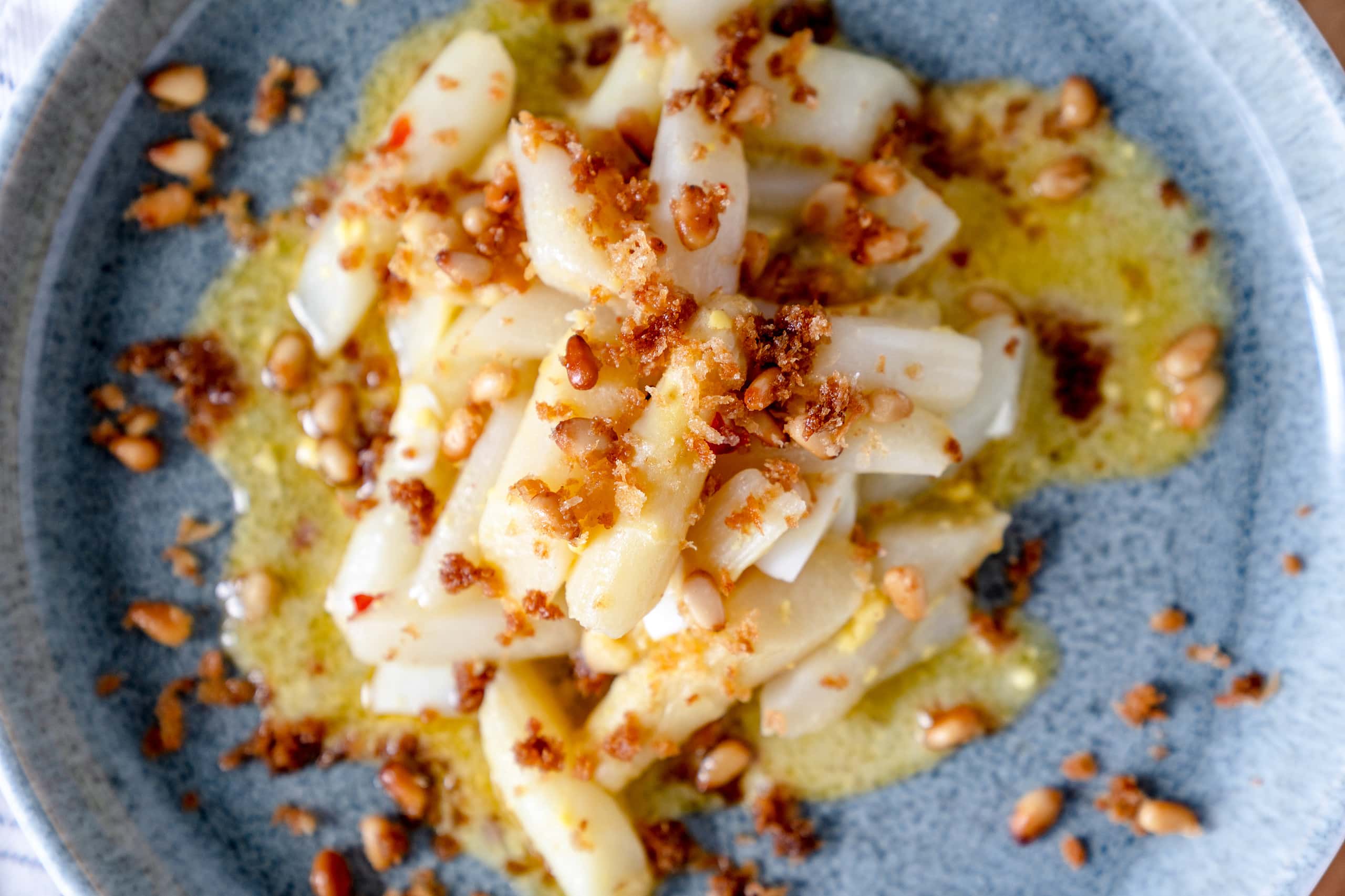 Dieser lauwarme Spargelsalat mit einem richtig würzigen und leckeren Dressing und dazu der Crunch von Panko-Bröseln und Pinienkernen. Ein absoluter Kracher