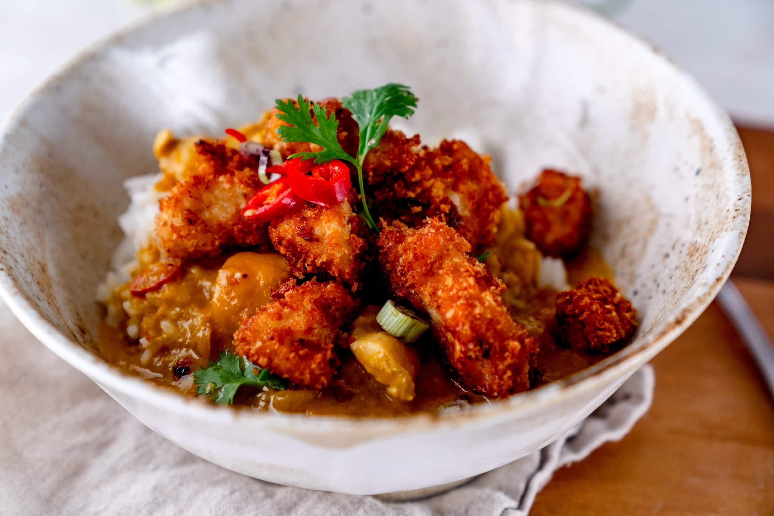 Mit Fischsauce und Gewürzen auf die gewünschte Konsistenz einkochen lassen. Mit Reis und der panierten Hähnchenbrust zusammen servieren.