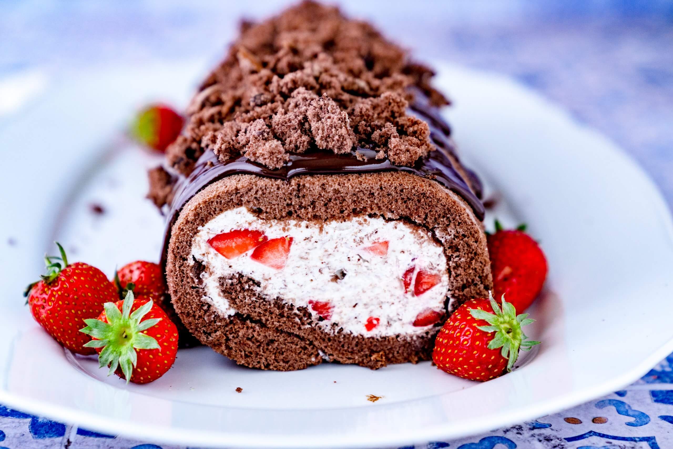 Die Zartbitterschokolade zusammen mit der restlichen Sahne (75g) auf dem Herd schmelzen. Den Kuchen aus dem Kühlschrank holen und dann die Schokosahne/Ganache auf der Rolle verteilen. Man kann die Rolle komplett einpinseln oder an den Seiten einfach runtertropfen lassen. Den abgeschnittenen Teigstreifen zerbröseln und auf die Ganache geben. Wer noch Erdbeeren übrig hat, kann die natürlich auch darauf geben.
