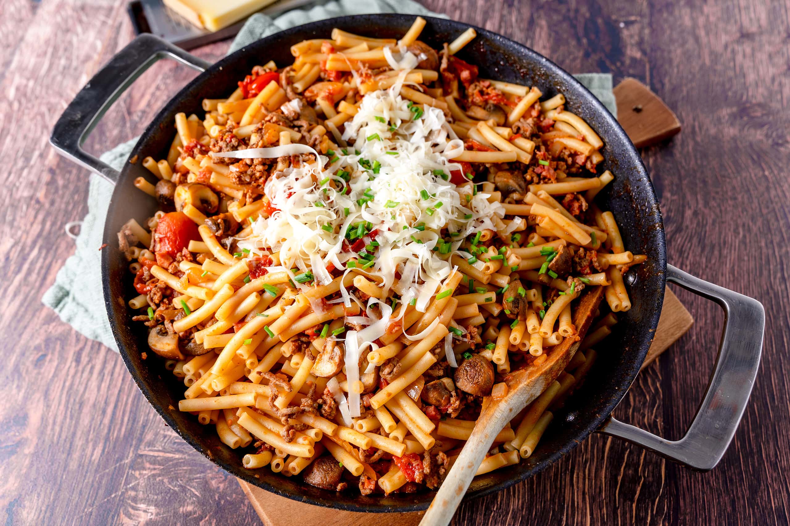 Die Hacksauce in der Pfanne mit Sahne vermengen, dann mit Salz und Pfeffer abschmecken. Nudeln untermengen, noch einmal abschmecken. Den Bergkäse reiben und unterheben. Und wer mag, packt den Schnittlauch noch drunter.