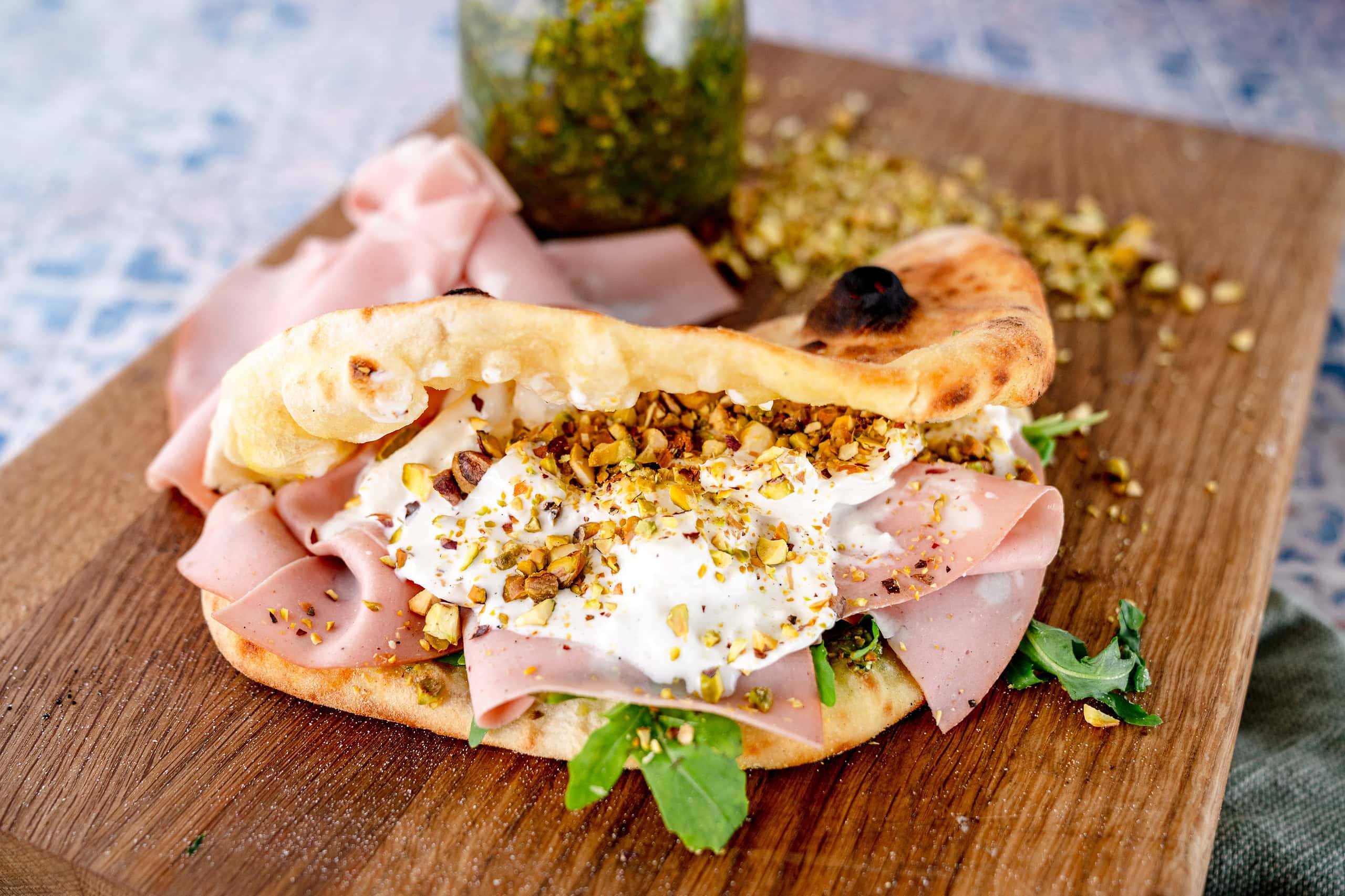 Das Panuozzo öffnen und das Pistazienpesto darauf verteilen, dann den Rucola, Mortadella und die Burrata darauf zerdrücken. Die Pistazienkerne darauf verteilen und einfach zuklappen.