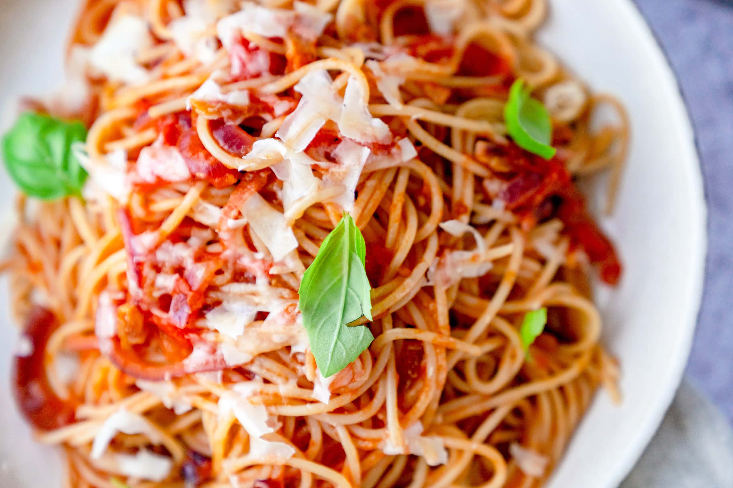 Auf den Teller servieren und mit Parmesan oder Pecorino bestreuen. Wer mag, gibt ein paar Basilikumblätter obendrüber.