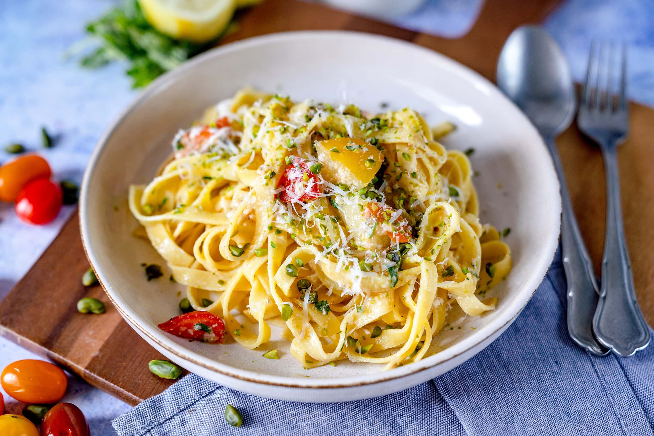 Pasta mit Pistazien – sommerfrisch, Jamie‑inspiriert und ohne Sahne; Zitronen, bunte Tomaten & Kräuter verbinden sich cremig dank Pastawasser. Pistazien‑Crunch on top – jetzt nachkochen und genießen!