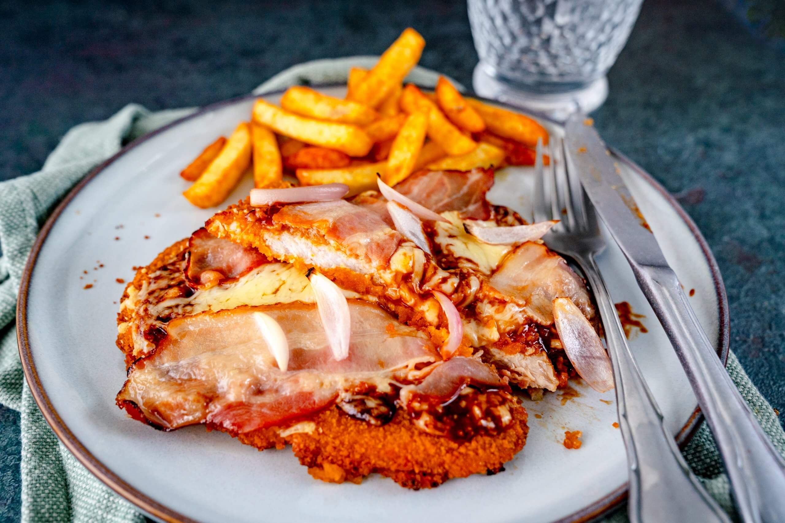 Schnitzel nach Packungsanweisung im Ofen garen, aber 2 Minuten vorher heraus holen. Die Schnitzel dann mit der BBQ Sauce bestreichen, Käse darauf verteilen, dann den Bacon und zum Schluß die Schalotte.