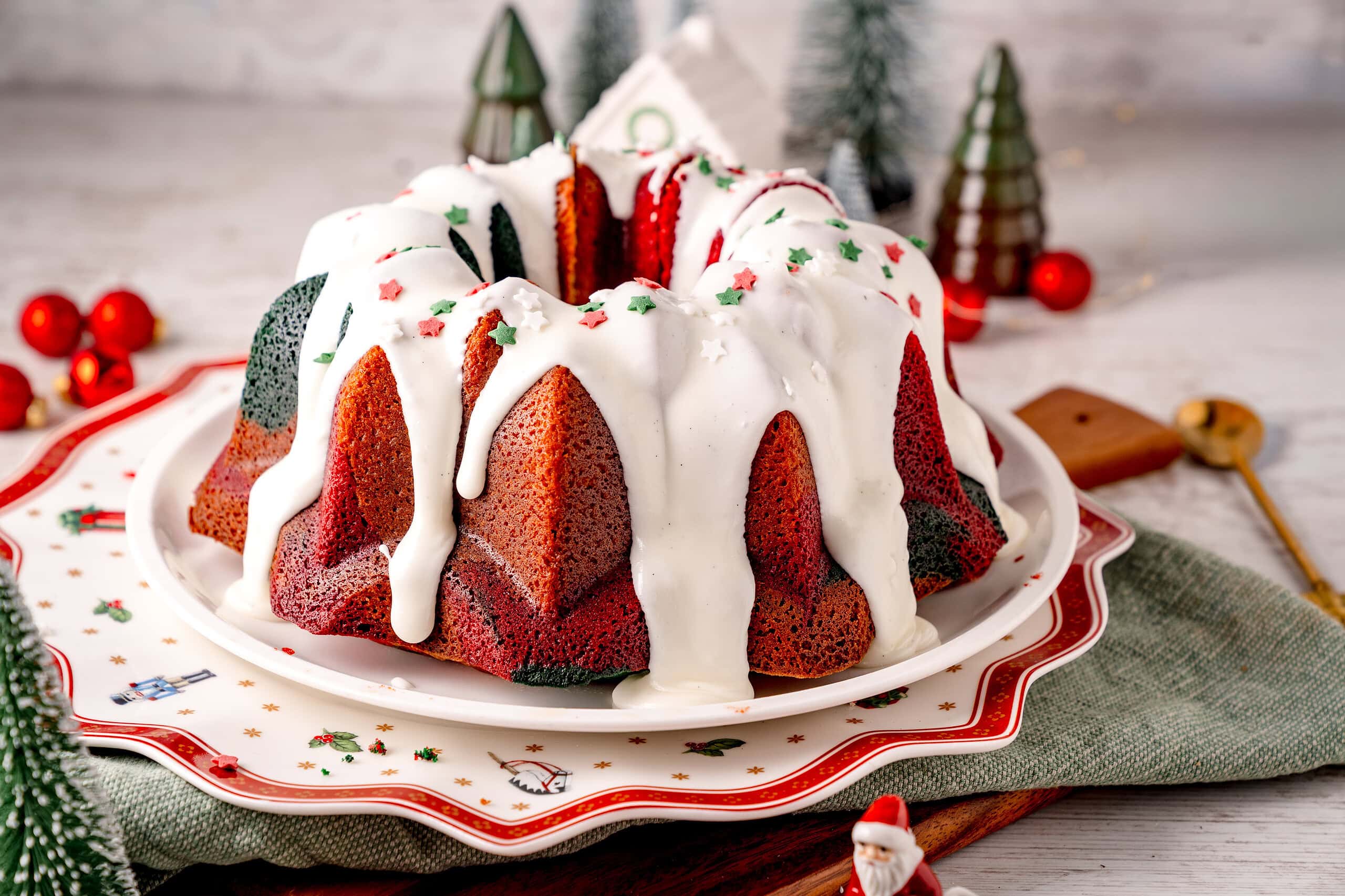 Dieser weihnachtliche Marmorkuchen ist dank Frischkäse unglaublich saftig und bleibt tagelang frisch. Mit seinen roten und grünen Farben ist er der perfekte Hingucker für die Adventszeit und Weihnachten. Gebacken in der Nordic Ware North Star Form wird er zum Festtags-Highlight.