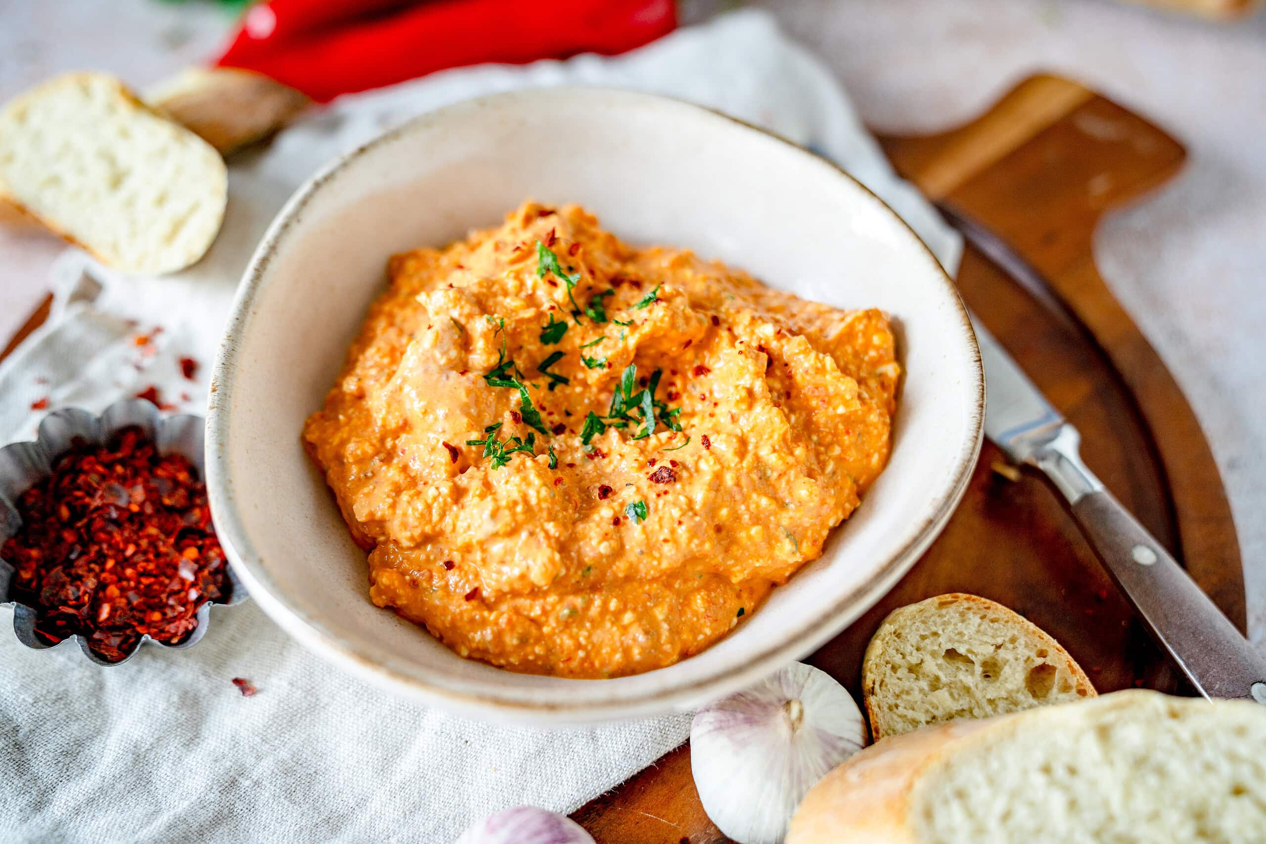 Unser Scharfer Grieche Dip ist die selbstgemachte Version des beliebten Supermarkt-Klassikers – cremig, würzig und in nur 5 Minuten fertig. Echter Feta wird mit Ajvar, griechischem Joghurt, Knoblauch und Paprika edelsüß püriert. Den Schärfegrad steuerst du ganz einfach über die Wahl von mildem oder scharfem Ajvar. Der Dip schmeckt perfekt zu Gegrilltem, auf frischem Baguette, zu Gemüsesticks oder als Aufstrich für Wraps. Am besten 2–3 Stunden im Kühlschrank durchziehen lassen – so entfalten sich alle Aromen.