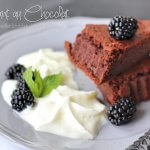 Leckerer Schokokuchen mit Sahne und weißer Schokolade, Joghurt und Orangen.
