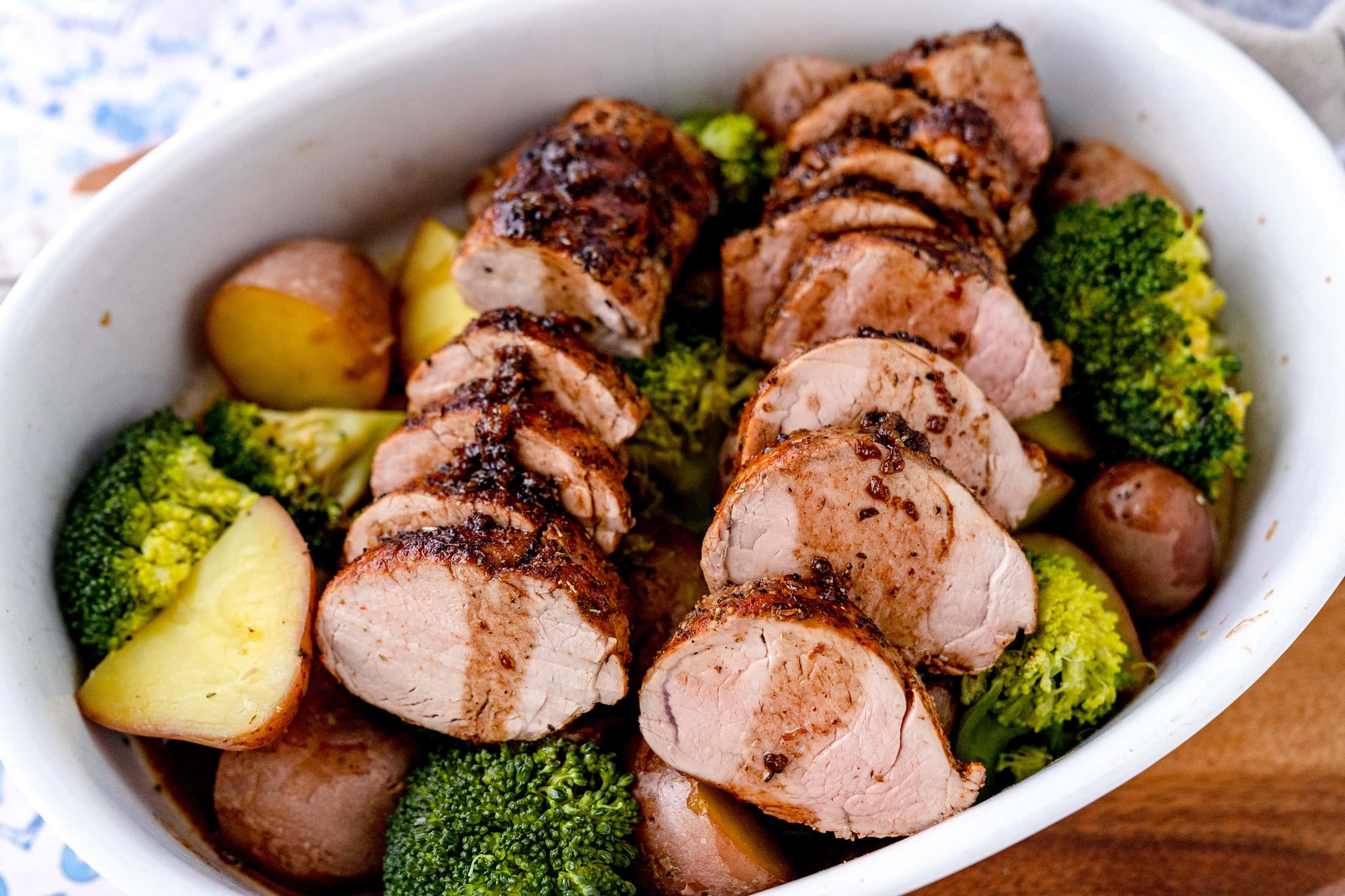 Das Schweinefilet aus dem Ofen holen (Kerntemperatur sollte bei 56°C liegen) und in Tranchen schneiden. Zusammen mit der Sauce und dem Gemüse servieren.