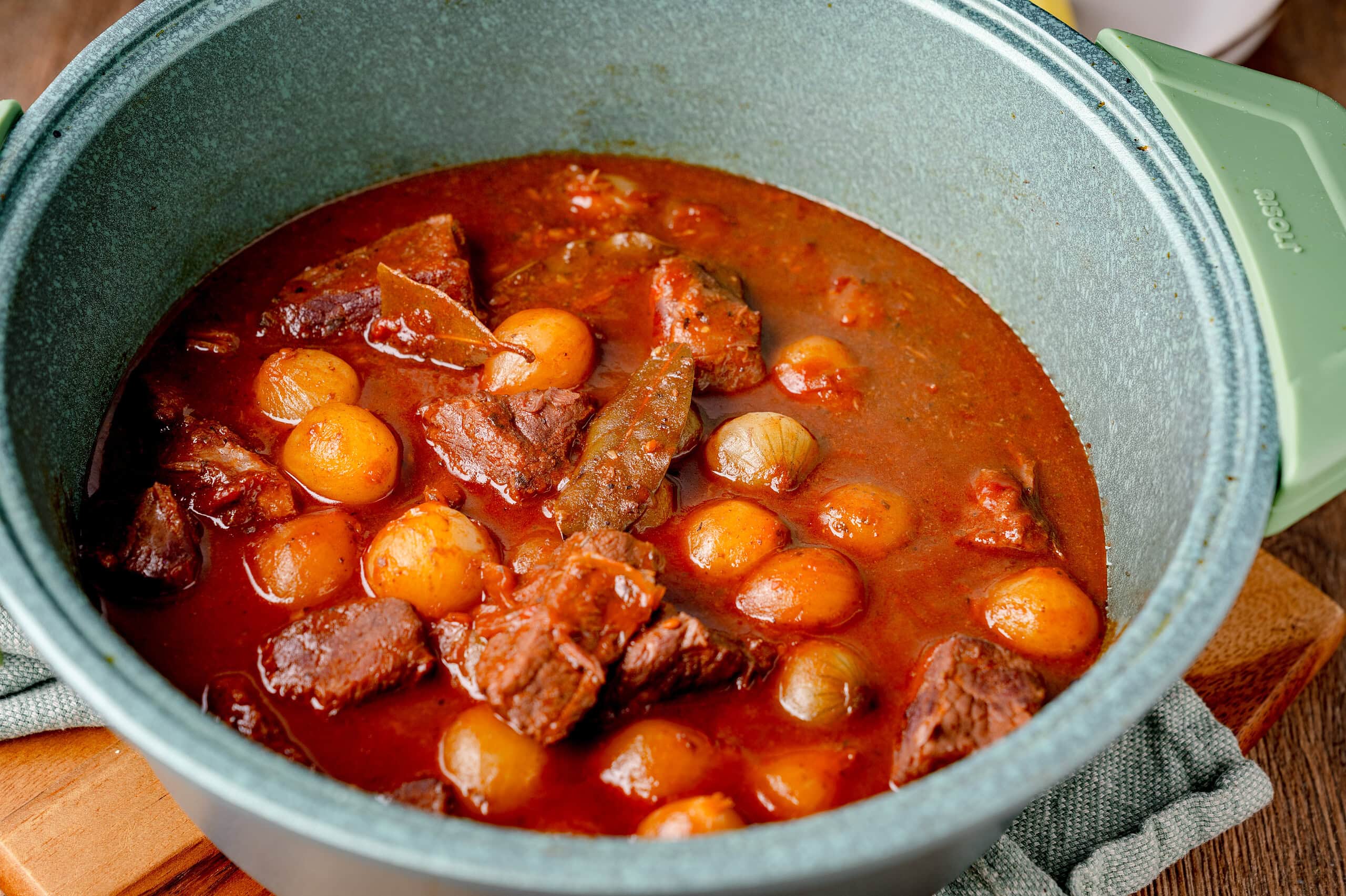 Anbraten: Erhitze reichlich Olivenöl in einem ofenfesten Bräter (z. B. Risoli Guss-Kasserolle). Brate das Fleisch darin scharf an. Gib die vorbereiteten Perlzwiebeln und den Knoblauch dazu und röste sie kurz mit.