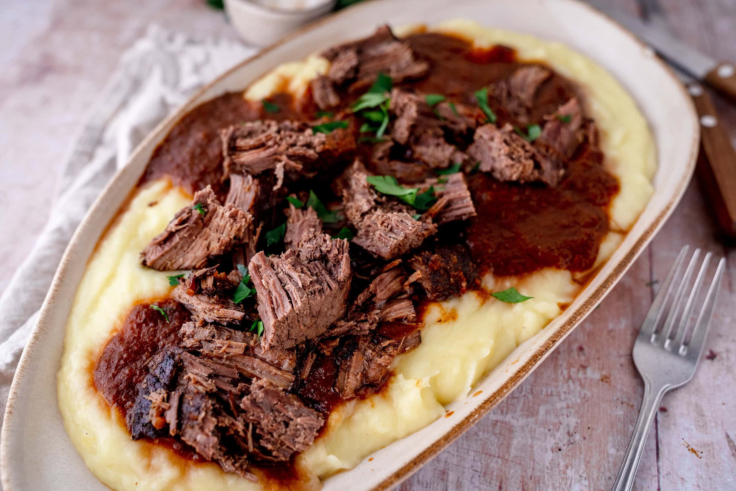 Lange garen: Mit geschlossenem Deckel im Ofen schmoren – entweder 3 Stunden bei 170°C oder 5 Stunden bei 130°C. Nach 2 Stunden Fleisch wenden und Flüssigkeit prüfen.
