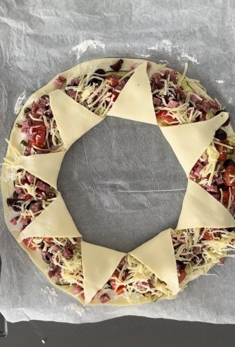 Ihr sollet nun eine freie Mitte haben und einen ziemlich belegten Außenring. Mit einem Messer die Mitte in Achtel schneiden, wie bei einer Torte, also erst halbieren, dann vierteln, dann achteln. Die entstandenen Dreiecke nun mit der Spitze über den belegten Ring legen.