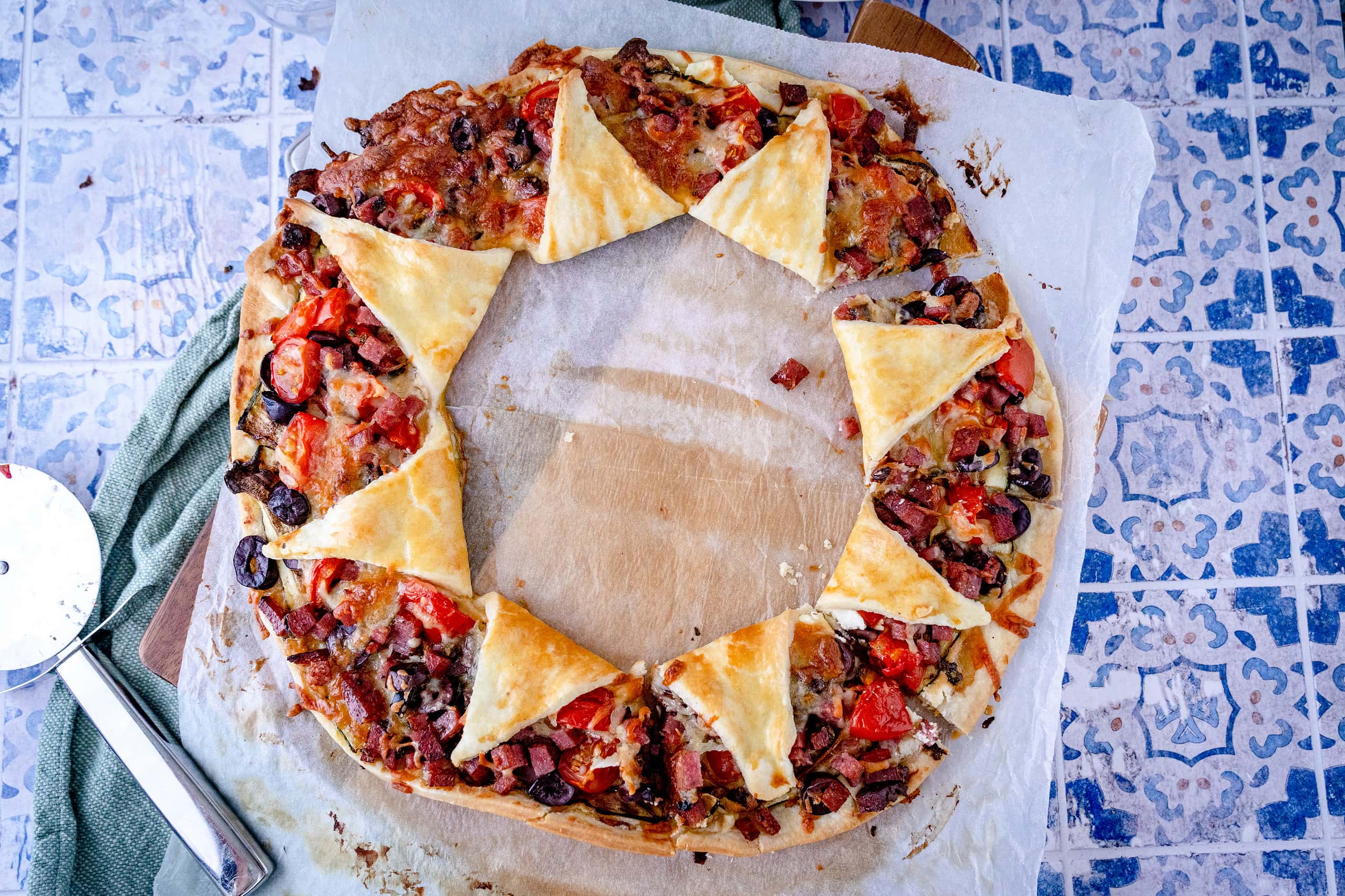 Den Teigboden nehmen und ausbreiten. Frischkäse auf einen äußeren Ring streichen (die Mitte muss zwingend frei sein) und darauf etwas Salz und Pfeffer geben. Die Zucchinischeiben auf dem Frischkäse verteilen. Jetzt heißt es nur noch verteilen: Die Tomatenviertel ringsum verstreuen, die Salamiwürfel ebenfalls und die kleingeschnittenen Oliven werden auch darüber verteilt. Zum Schluss den geriebenen Käse rübergeben.
