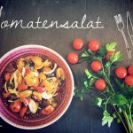 Die Zwiebel schälen und in dünne Scheiben schneiden. Tomaten und Zwiebeln miteinander vermengen, anschließend die Petersilie hacken und dazugeben.